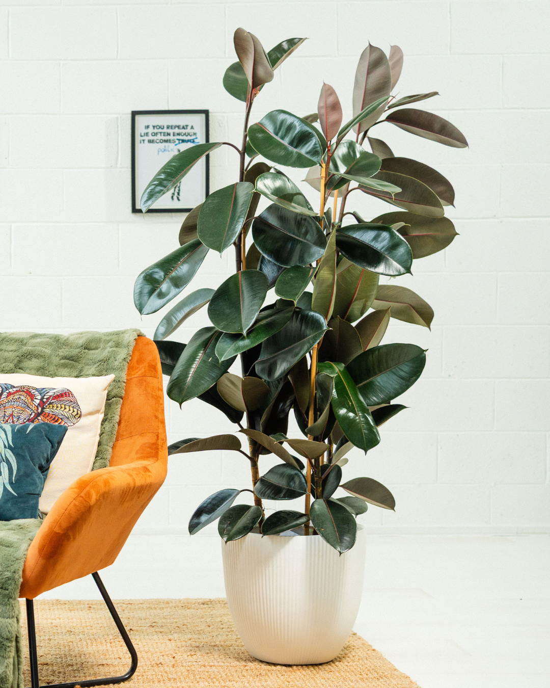 The Ficus Robusta, better known as the Rubber Plant — is the definition of low-maintenance luxury. With its glossy, deep green leaves and strong upright form, it brings instant polish and calm to any room. Native to Southeast Asia, this plant has earned its place as a design classic, simple, sculptural, and quietly dramatic.