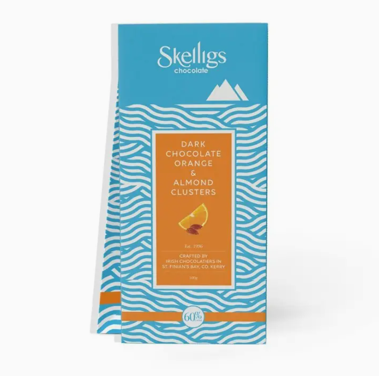 Crunchy Almonds and Orange enrobed in Dark Chocolate 60% Cocoa.