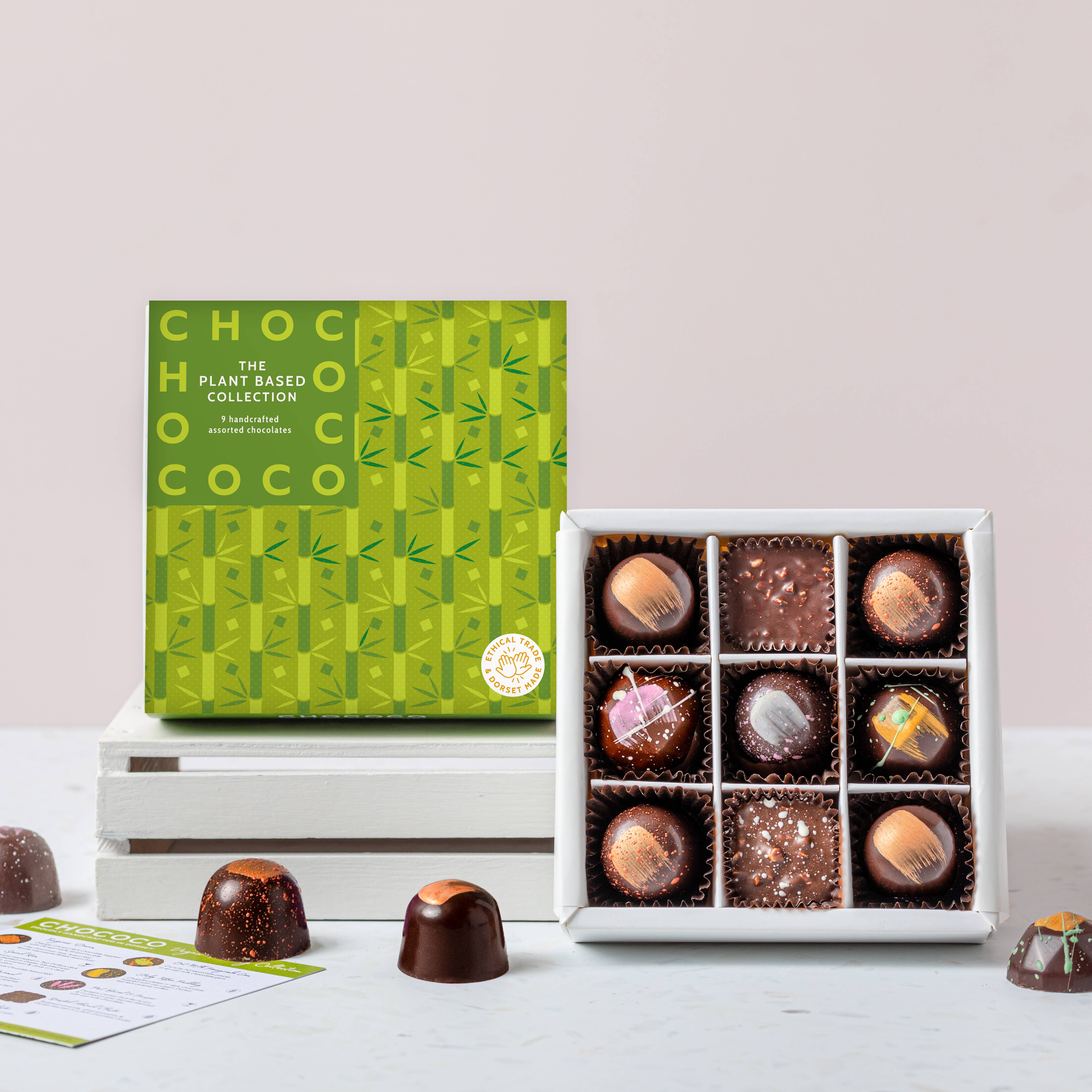 A selection of gorgeous vegan-friendly flavours in a selection box of 9 chocolates