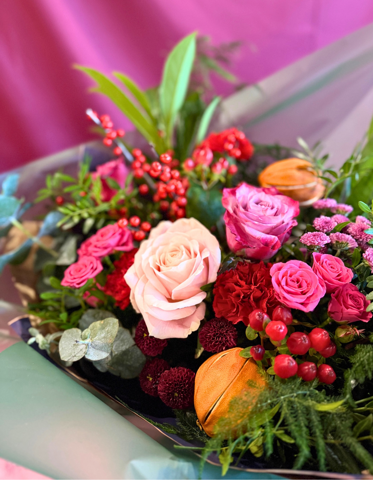 Merry & Bright is our December seasonal show off, bold pinks, rich reds and glossy winter foliage, lifted with pops of berries and fresh citrus for that extra hit of Christmas cheer.