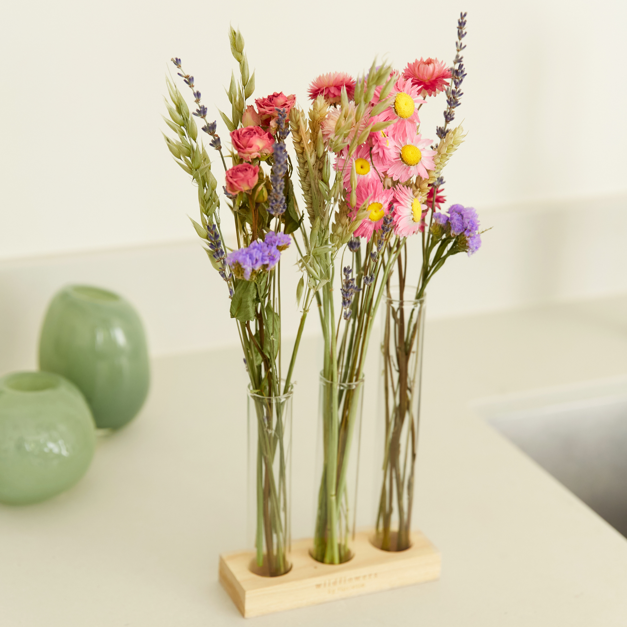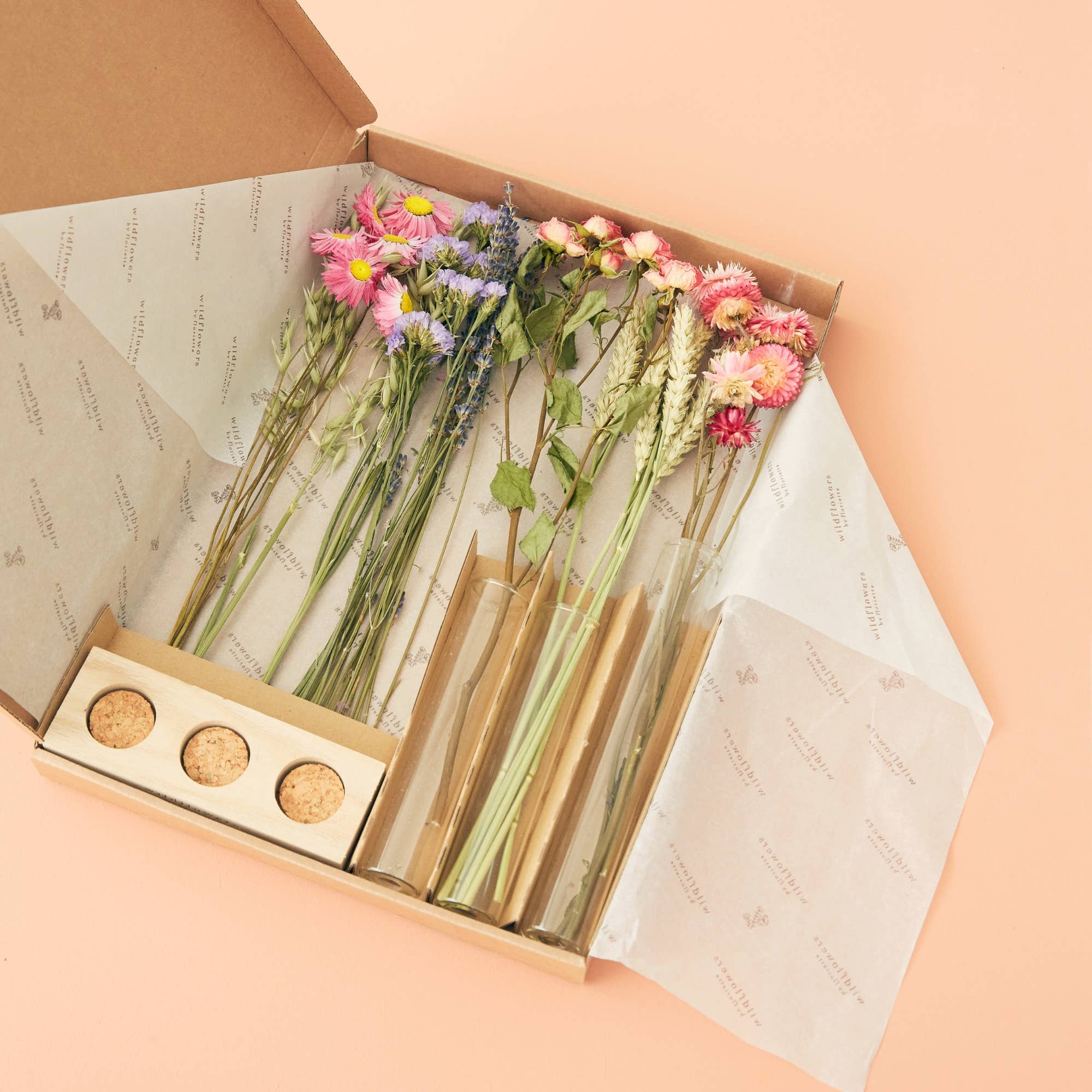 Our dried flower trios come beautifully packaged in custom letterbox boxes — designed to arrive safely, no matter where they’re headed. Each set includes a wooden stand with three mini glass vases, ready to display straight from the box.