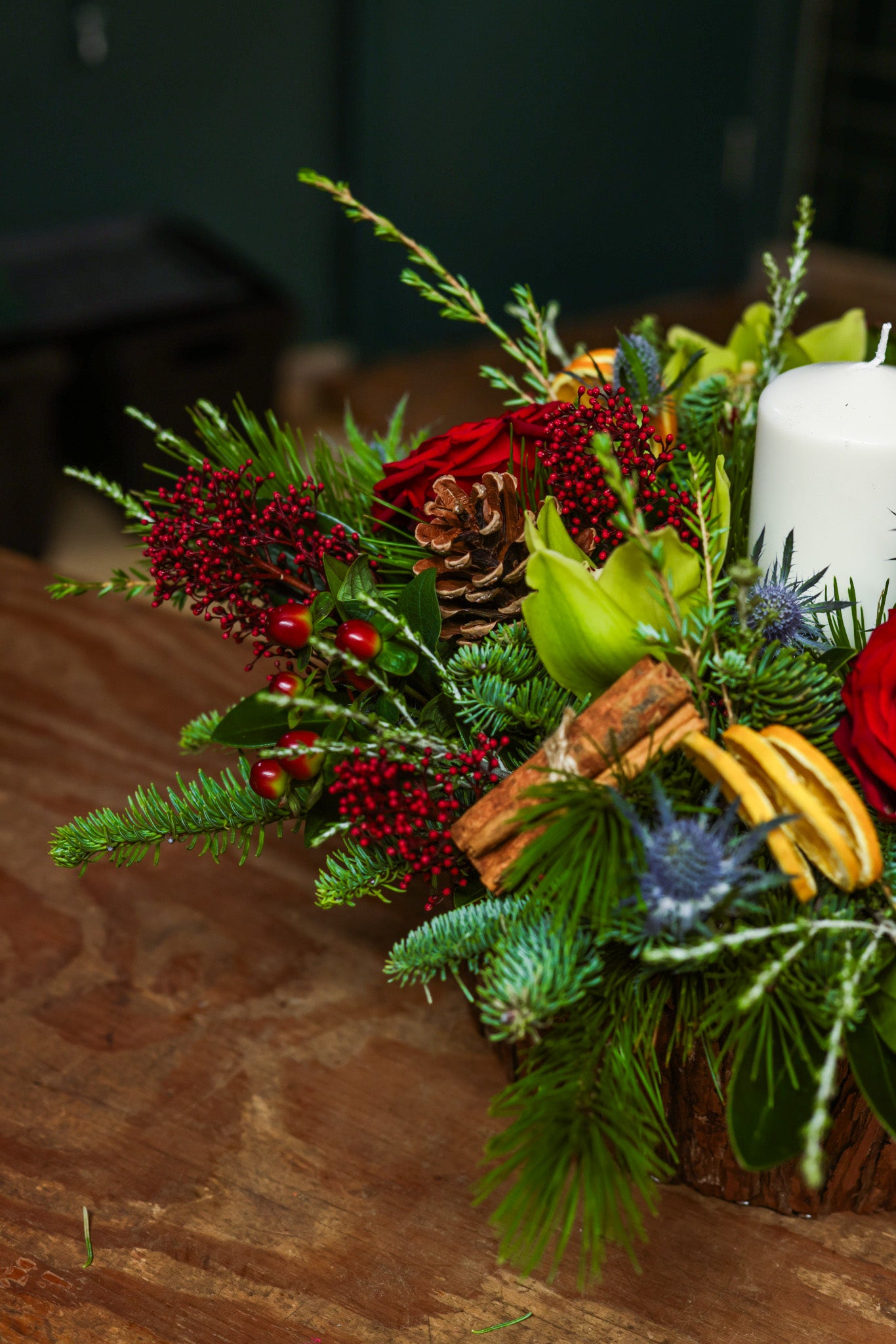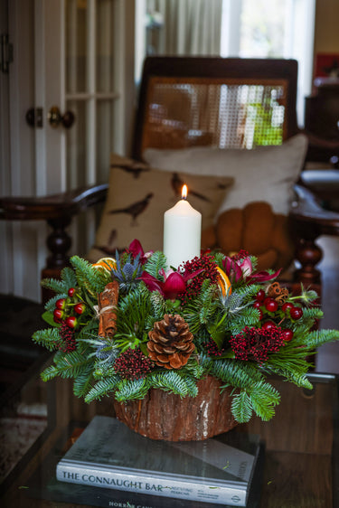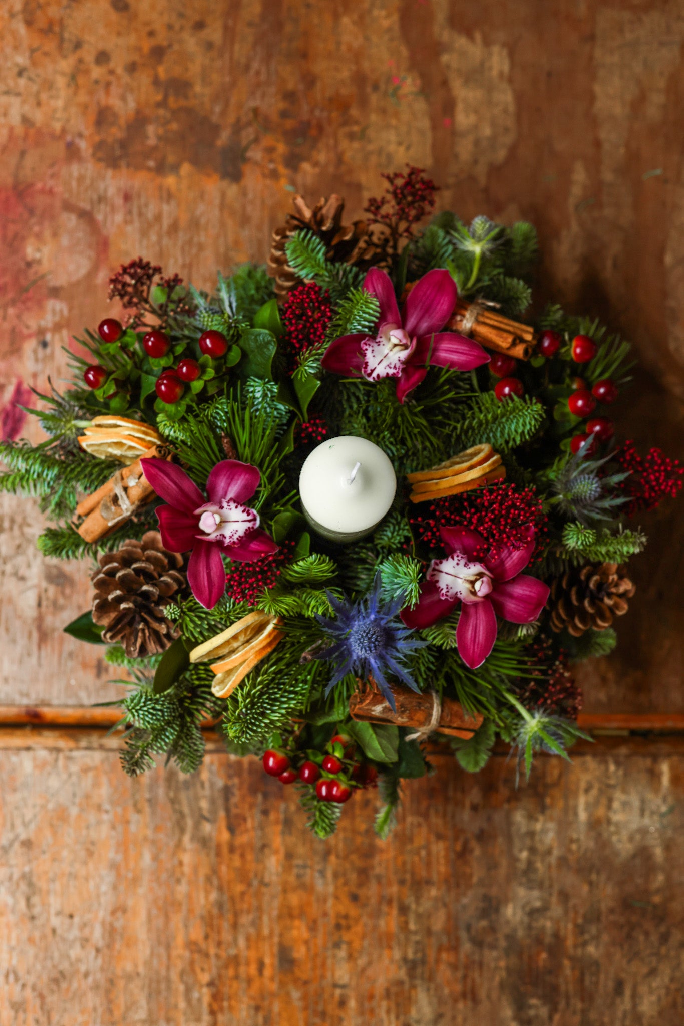 Our Winter Garden favourite, a lush, festive centrepiece nestled in a base of fragrant spruce, silver sussex, and skimmia. You’ll find orchids, thistle, and hypericum berries woven through, finished with dried fruits, pinecones, and a soft-glow pillar candle to set the mood.