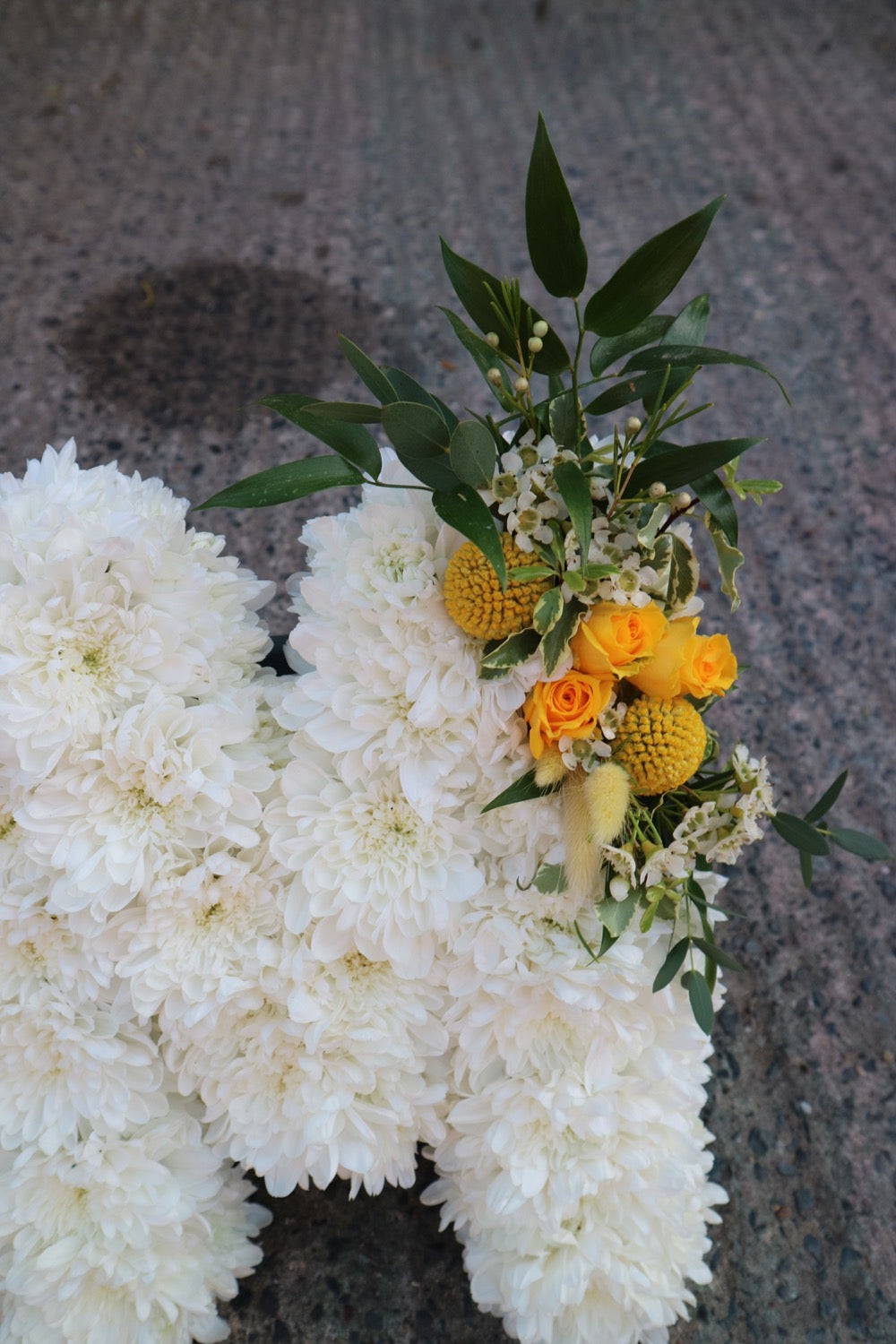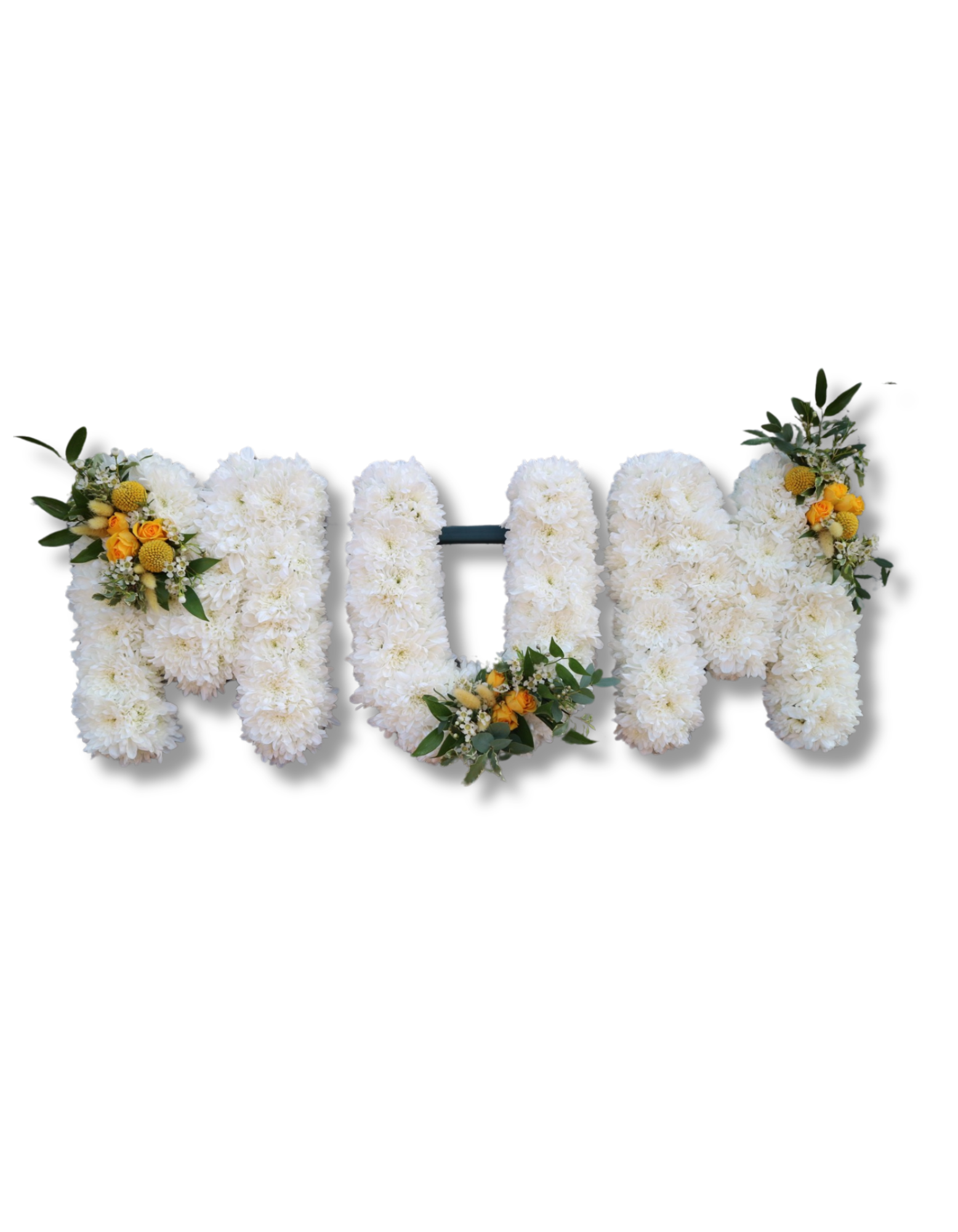 Funeral flower letter sizes are around 30cm and are always uppercase letters and created on a white chrysthemum base with personal floral touches.