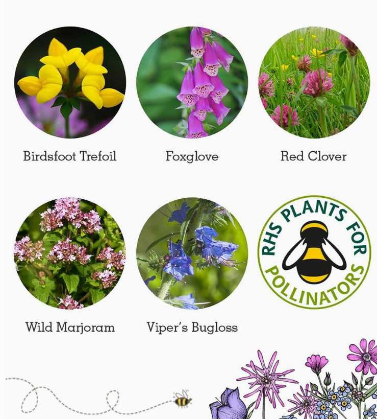 A carefully selected mix will attract solitary bees, honey bees and bumblebees – includes Birdsfoot Trefoil, Foxglove, Red Clover, Viper’s Bugloss and Wild Marjoram – all bee-friendly plants named by the Bumblebee Conservation Trust. We’ve added a sprinkling of pollinator-friendly annuals Chamomile, Cornflower, Corn marigold, and Night-flowering catchfly.