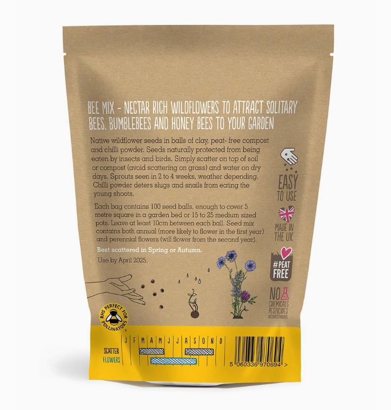 Made in Seedball HQ in North London - from a mixture of UK native wildflower seeds, clay, peat-free compost and chilli powder. The clay protects the seeds from wildlife, and once water has permeated the clay, the seeds inside will germinate, helped along by nutrients and minerals contained within the ball. The chilli powder deters slugs and snails while the seed ball degrades and and the seeds sprout.