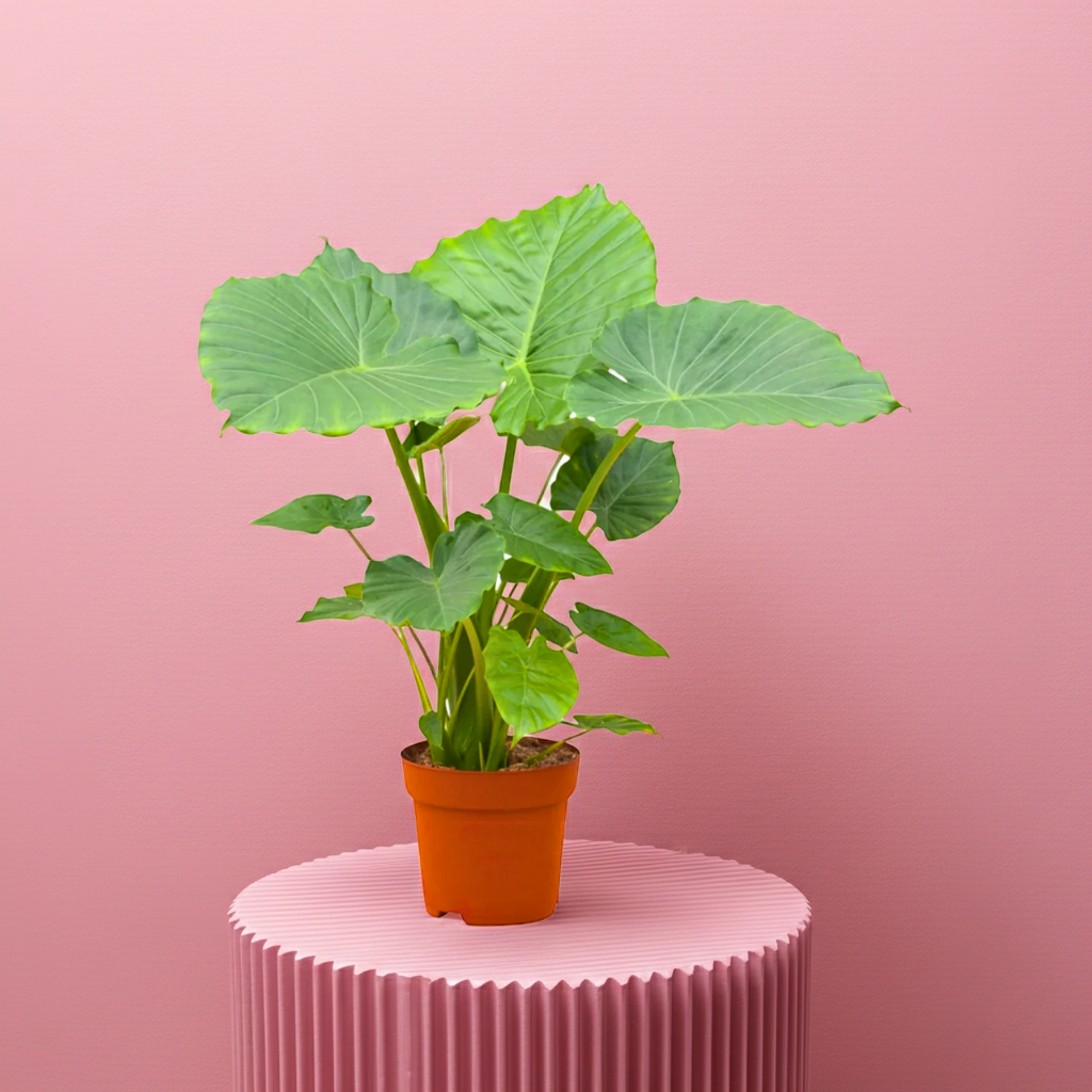 A bold member of the Araceae family, Alocasia gageana is prized for its thick, sturdy stems and dramatic, upward-pointing foliage. Mature plants can produce striking, heart-shaped leaves with undulating edges that reach up to 60cm across, giving this variety an architectural, statement-making presence.
