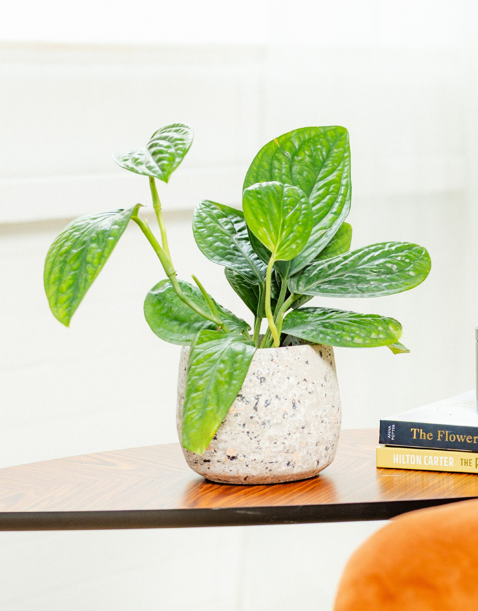 A compact pothos with serious texture, Marble Planet is all about those thick, rippled leaves marbled in deep greens and silvery tones. Unlike trailing pothos varieties, this one grows in a more upright, bushy form — making it perfect for shelves, side tables, or anywhere you want impact without the sprawl.