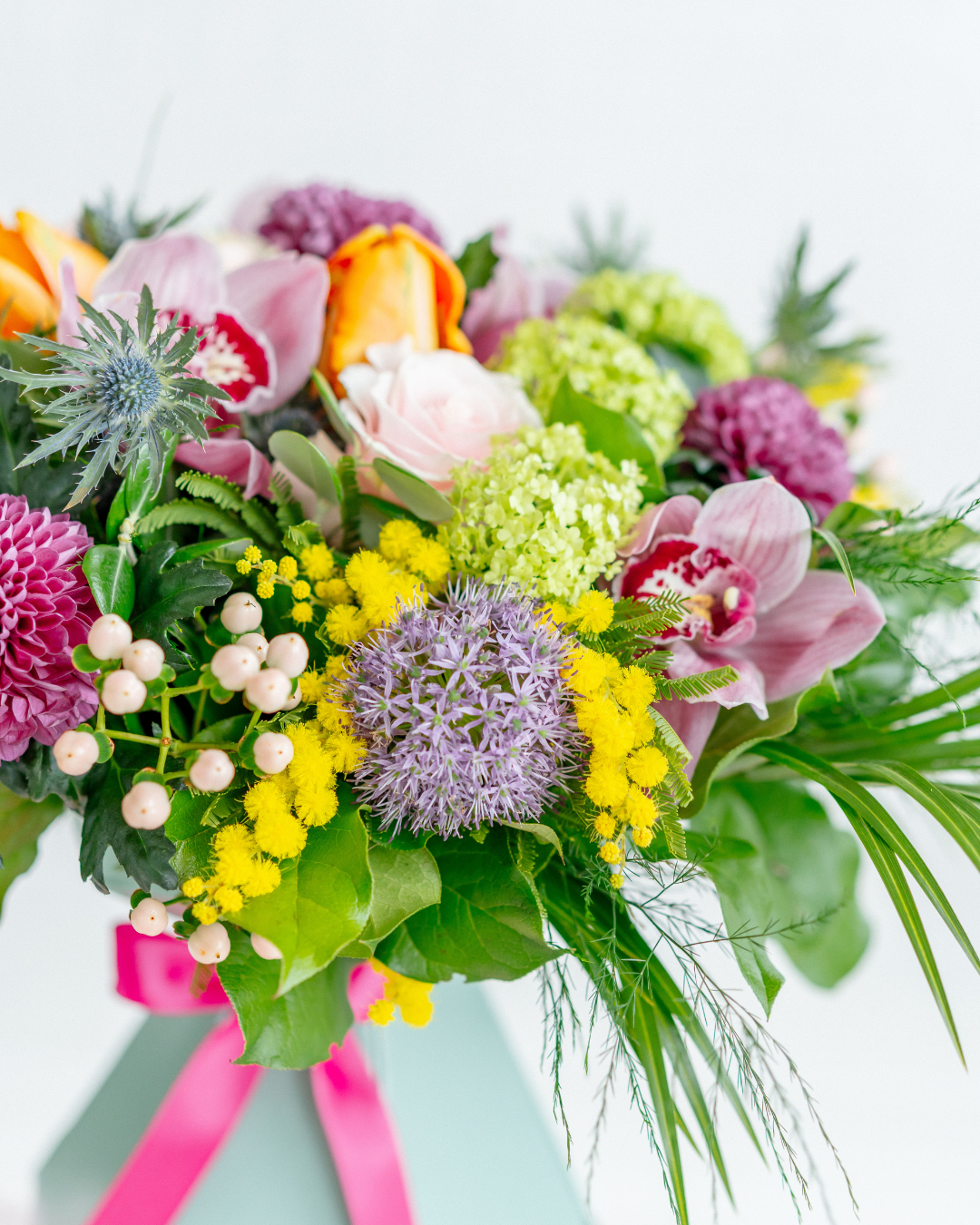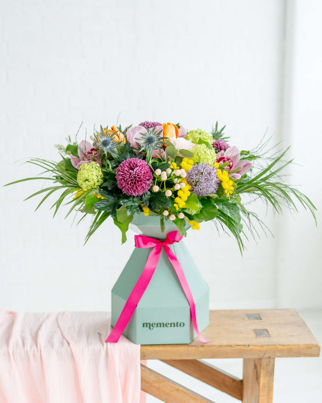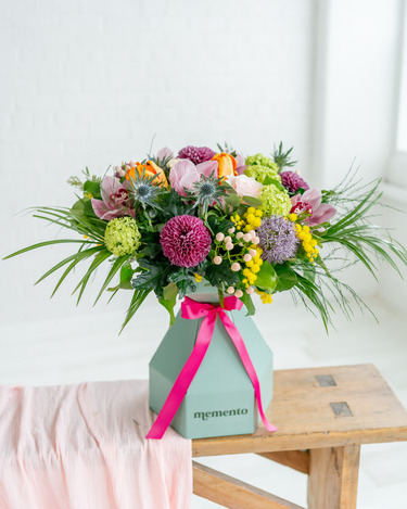 Packed with a beautiful combination of premium cut seasonal blooms styled full and all round in our signature finish, refined with that expert attention to detail that unmistakable Memento. Think bold roses done two ways, standout stems such as orchids, and layered texture, arranged to feel complete from every angle and delivered in our superior presentation box.