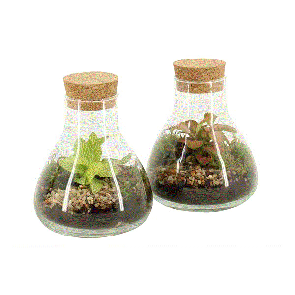 A beautiful conical flask filled with a mix of tropical plants and sealed with a cork lid