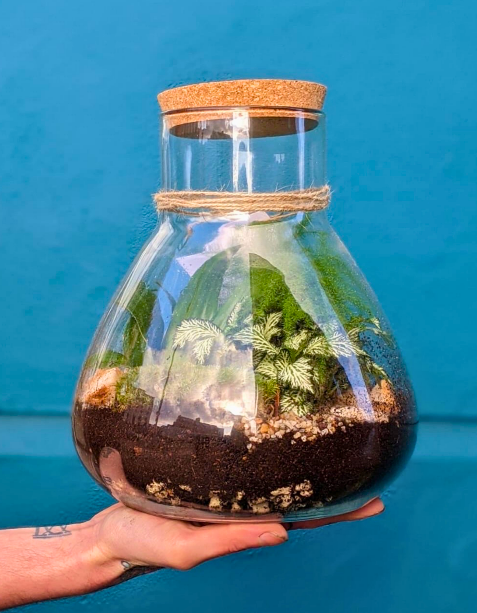 The wide base and tapered neck give it presence and balance, while the cork lid locks in moisture to keep the internal climate steady and thriving.