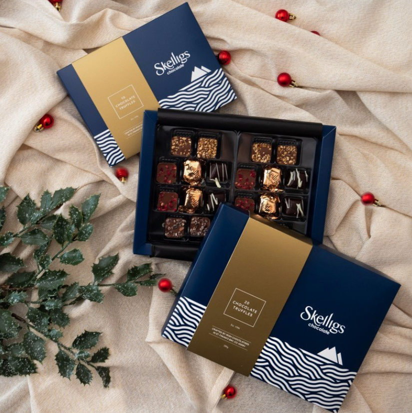 A symphony of exquisite flavours that’s bound to make your celebrations truly magical. Each truffle is a masterpiece, meticulously crafted with the finest ingredients, ready to enchant your taste buds. As you unwrap the box, you’ll discover a delectable variety of rich dark and velvety milk chocolates, all adorned with elegant patterns. Whether you’re sharing these truffles with cherished guests, presenting them as a thoughtful gift, or indulging in their luxury yourself, this collection is your invitation to embrace every delightful bite. This 20 truffle option is a collection of the most popular flavours. Hazelnut praline, Vanilla Ganache, Salted Caramel, Smooth Milk Chocolate and Raspberry & Coconut.