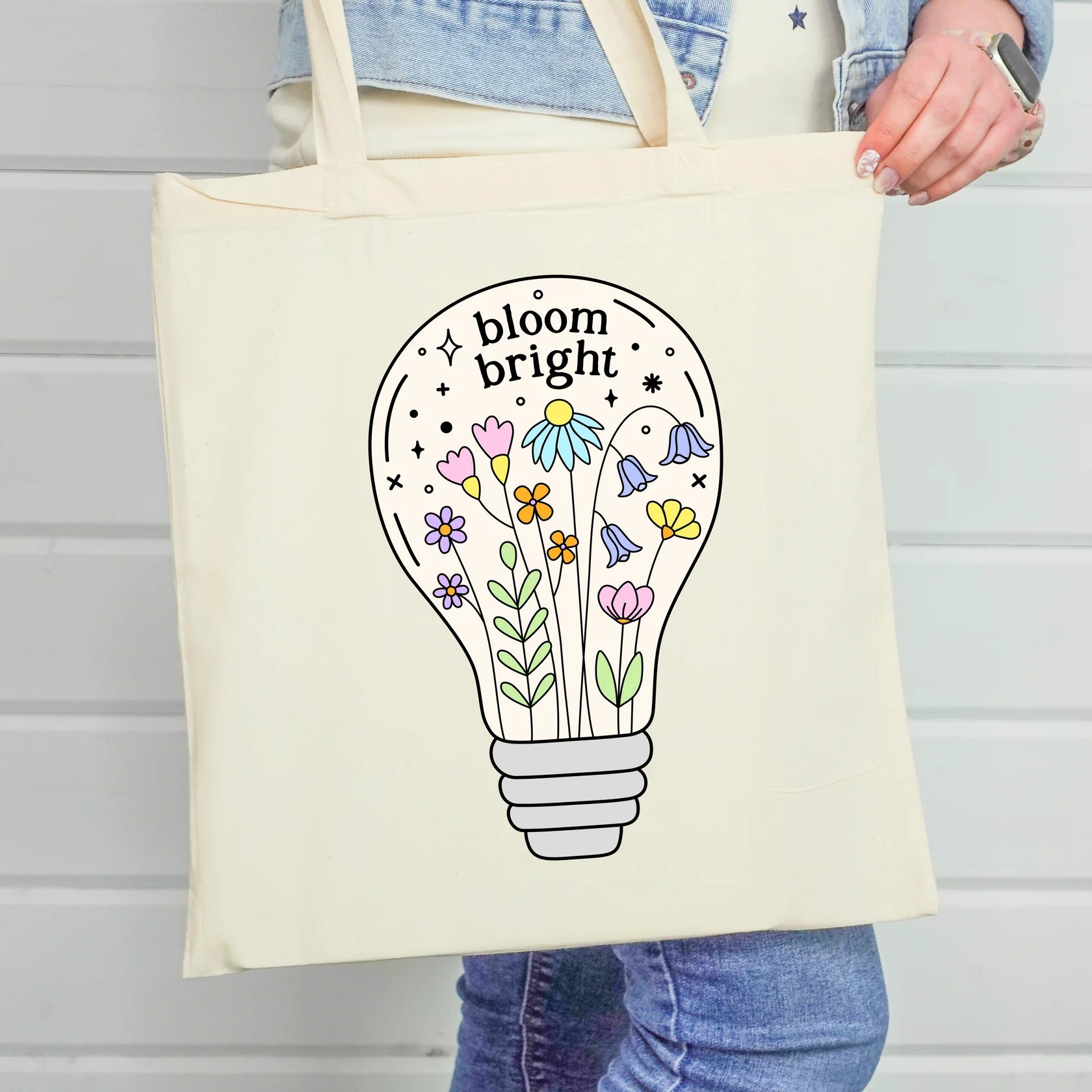 This tote bag is the perfect companion for the go-getter who wants to spread a little positivity. Its design features a lightbulb transformed into a vibrant garden, bursting with colourful wildflowers. The uplifting message "Bloom Bright" takes centre stage, reminding you to blossom wherever you go.