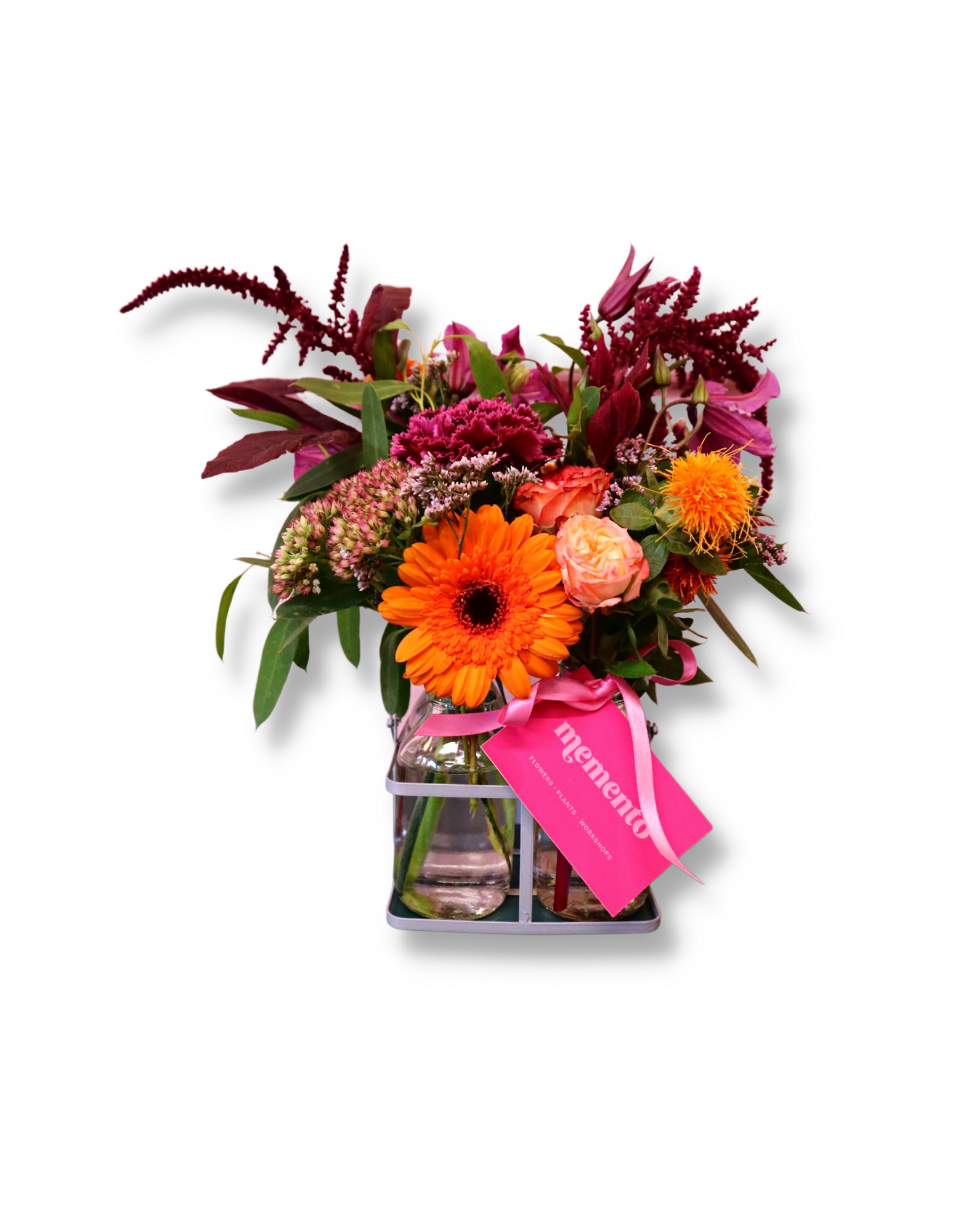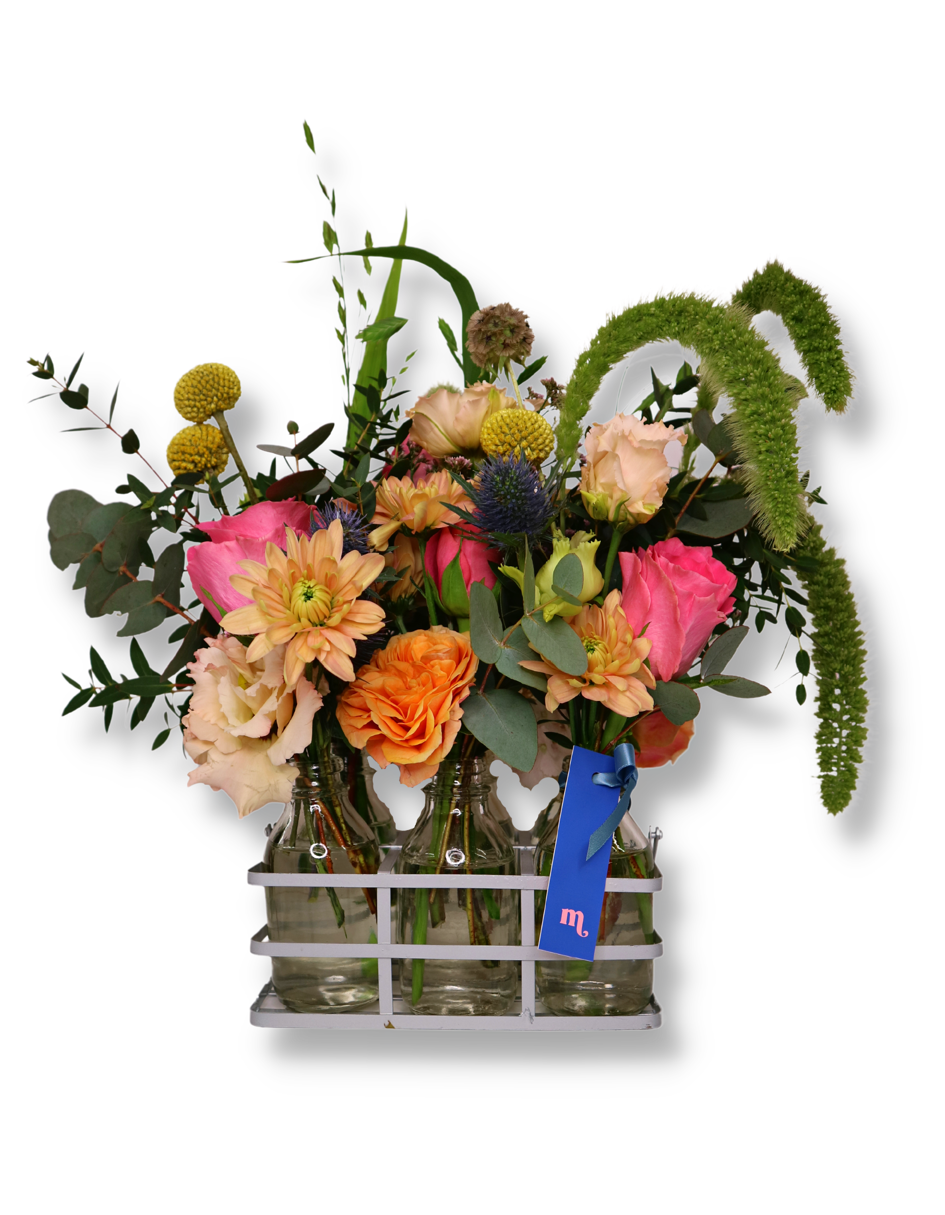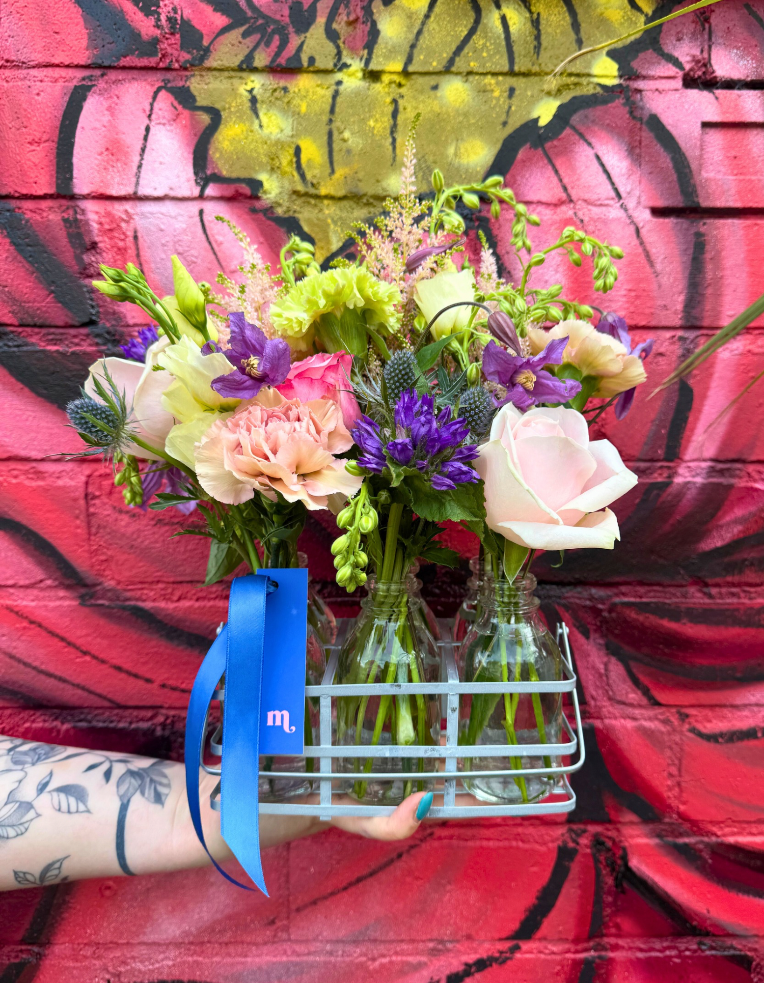 A Memento favourite with a twist. Bottle Buds are smaller floral arrangements styled in mini glass milk bottles and set in a sleek metal tray, ready to be placed, scattered, or styled however you like.