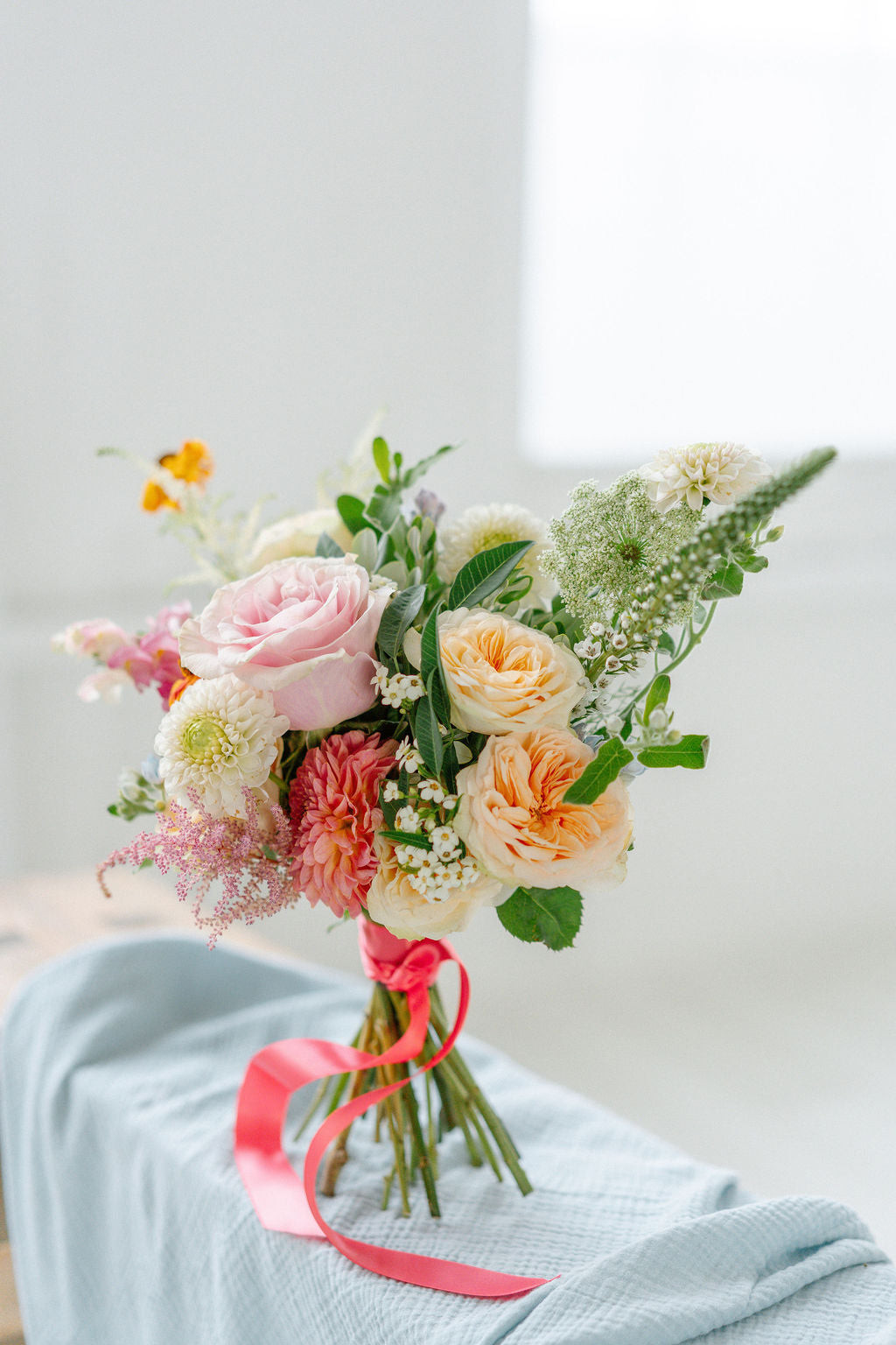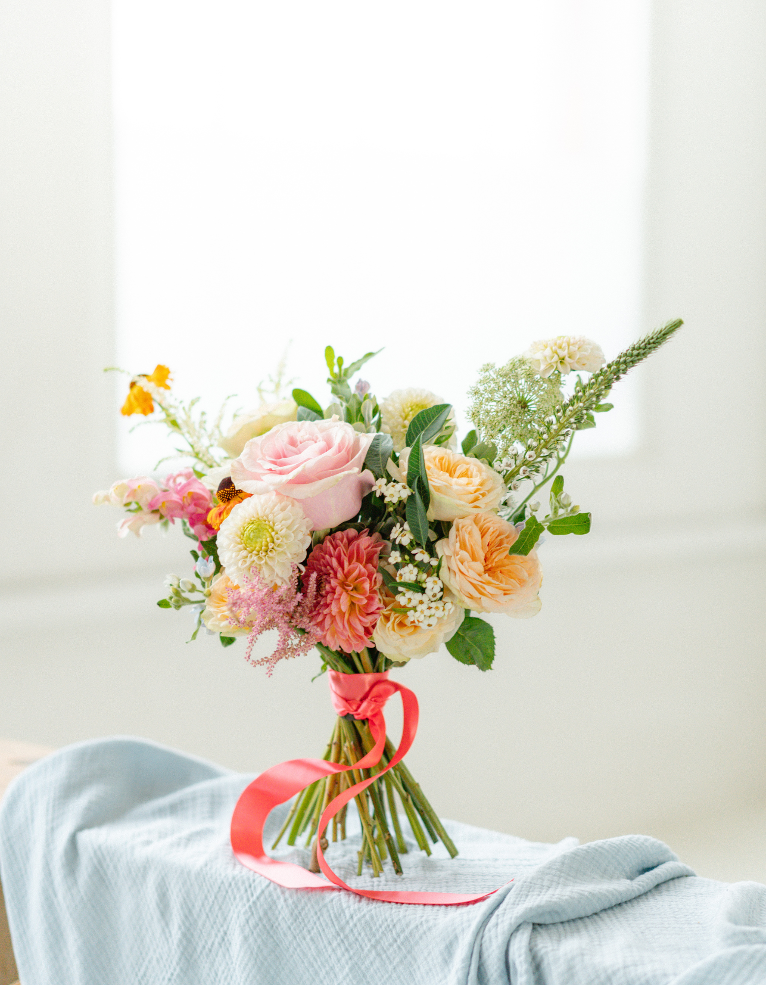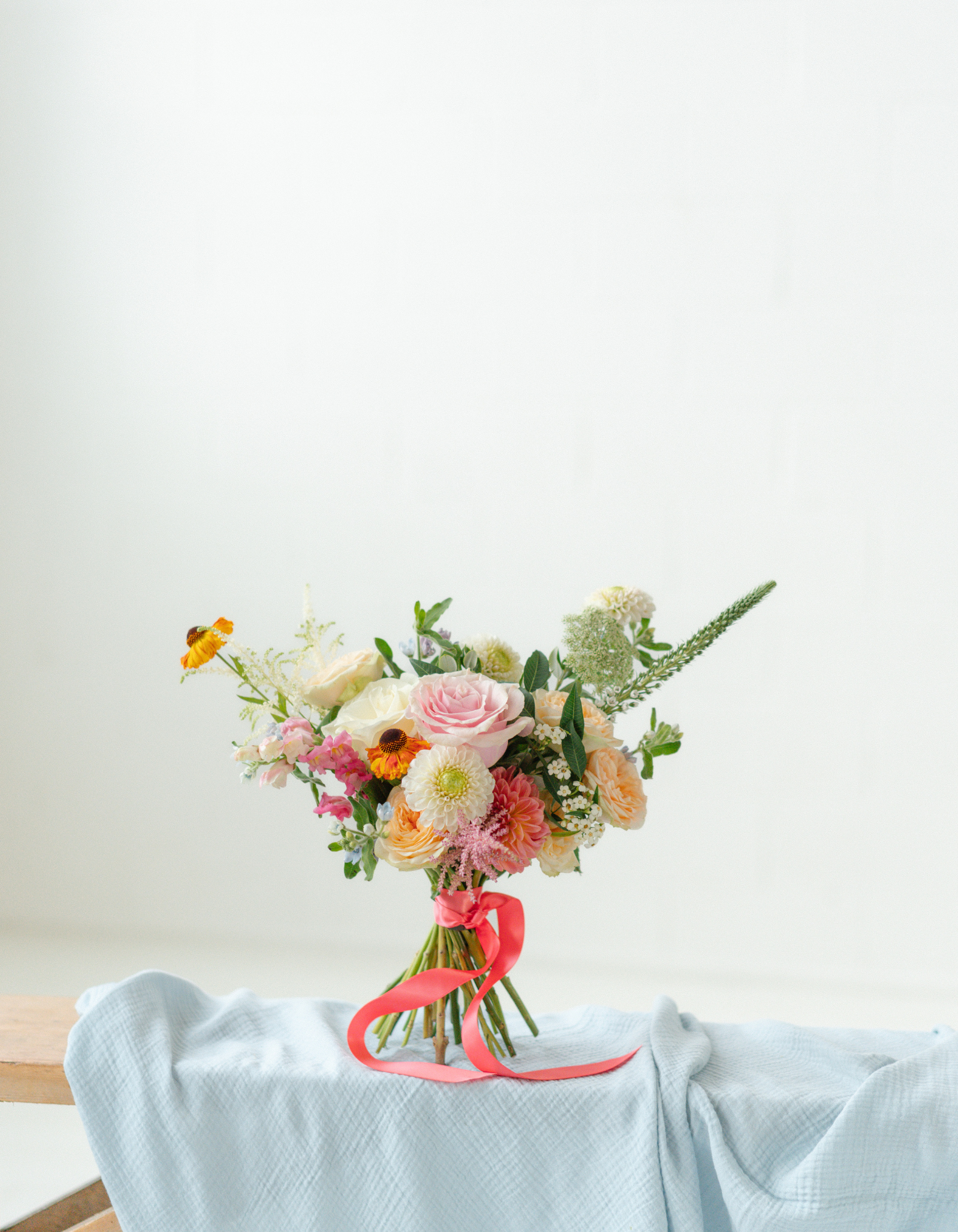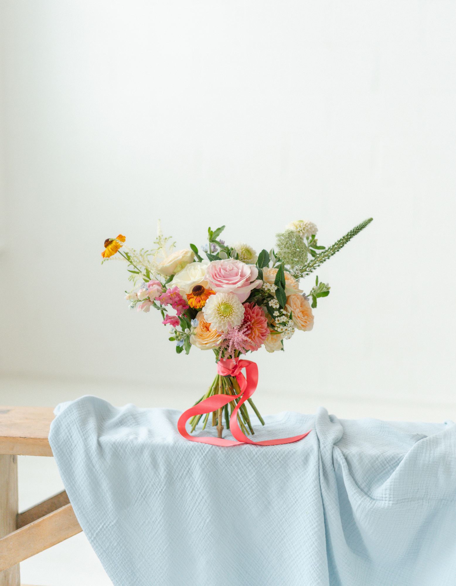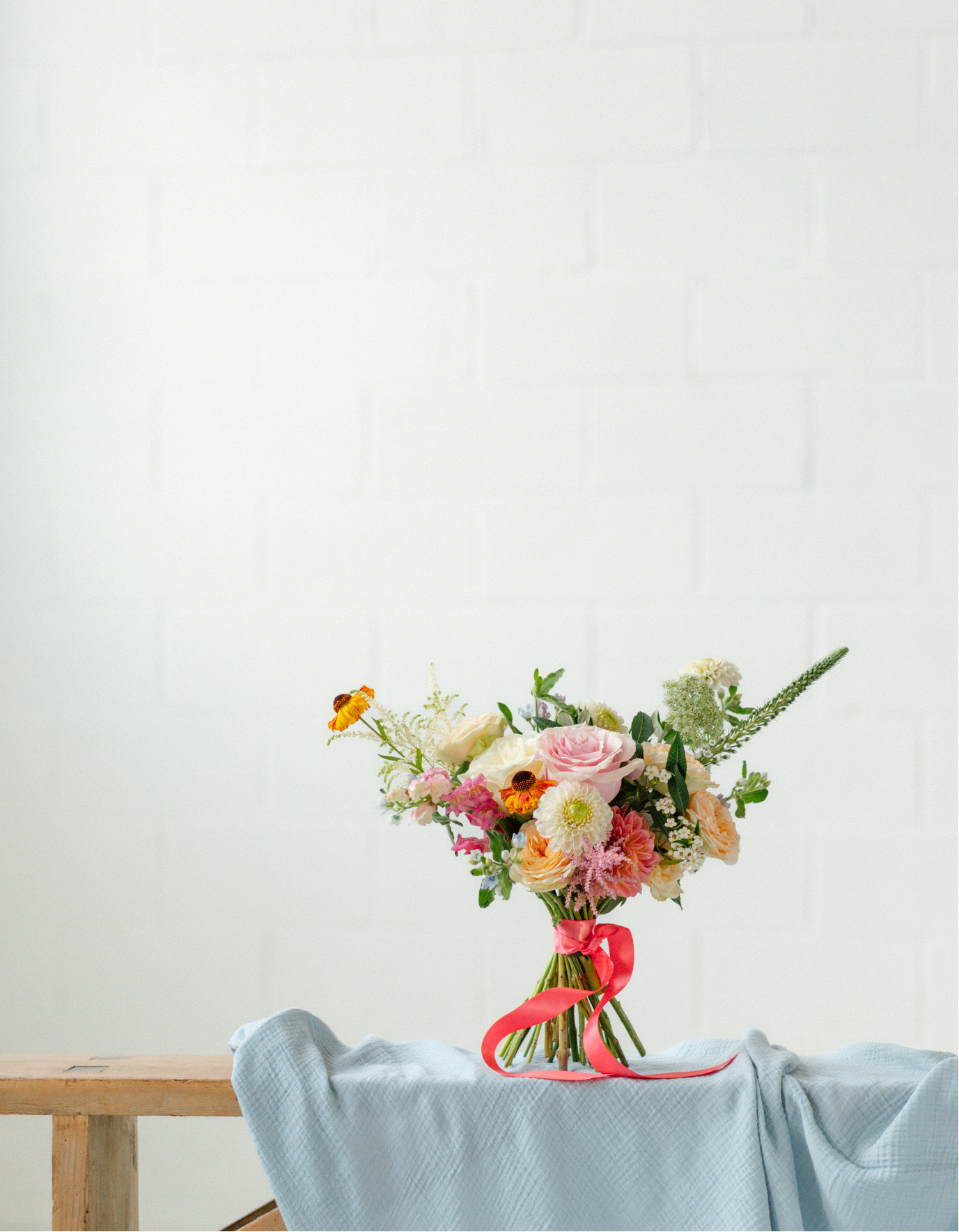 • Bridesmaid Bouquet — a smaller hand-tied bouquet bursting with beautiful seasonal blooms, finished with a satin ribbon handle in a coordinating shade.