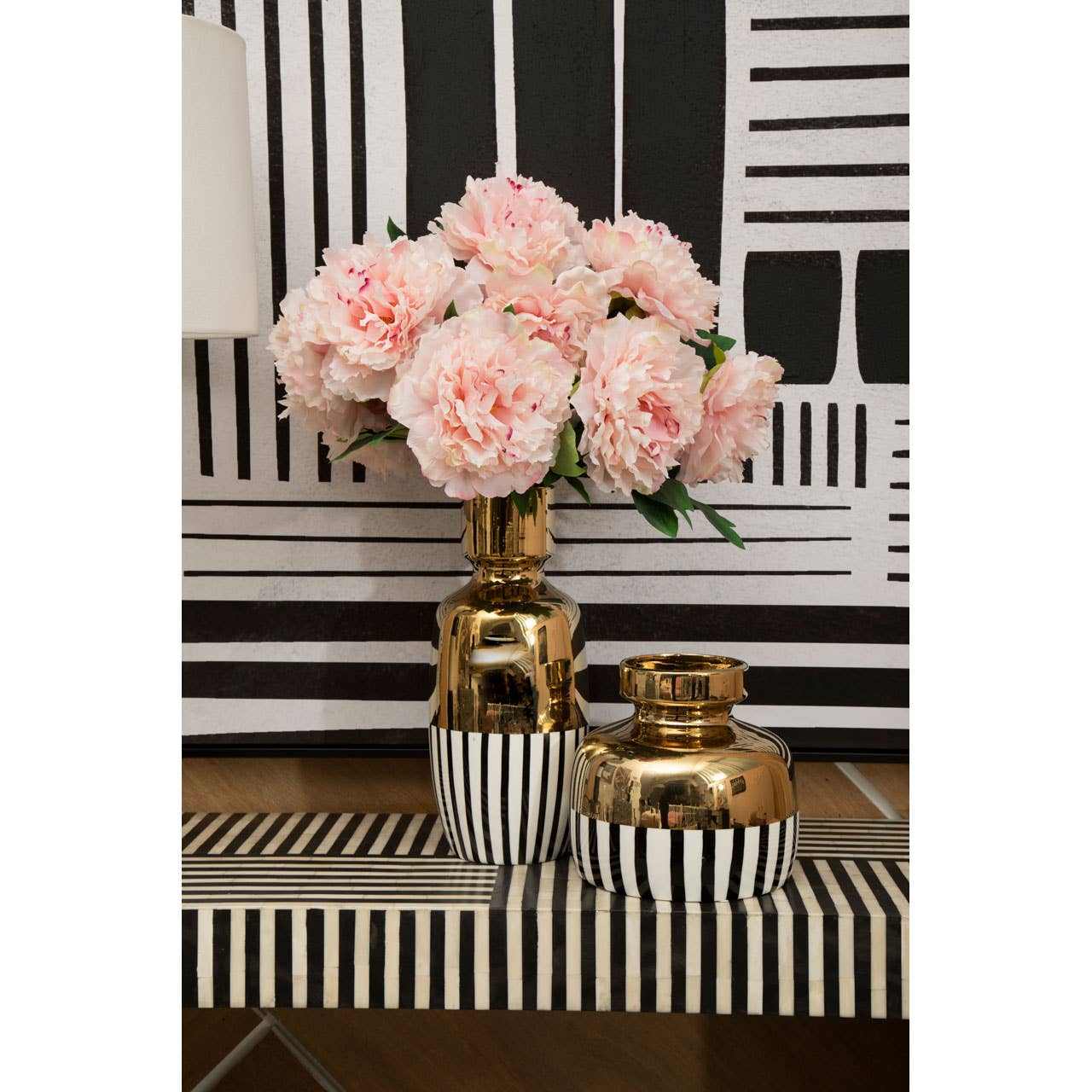 The lower half of the Cassia vase boasts alternating vertical stripes of black and white, creating a striking contrast with the rich gold finish of the vase's top. (Product Dimensions: 16cm x 36cm x 16cm x 2kg)