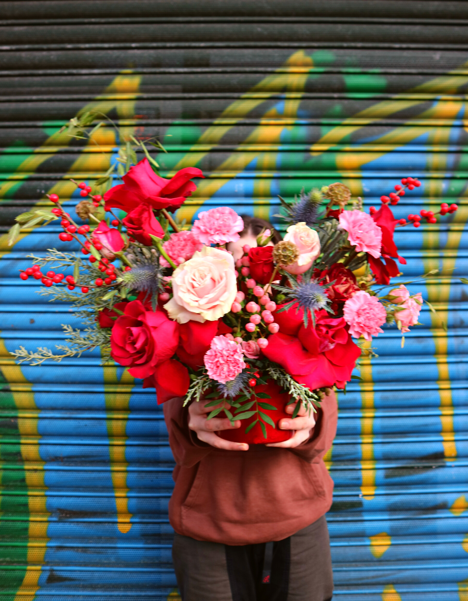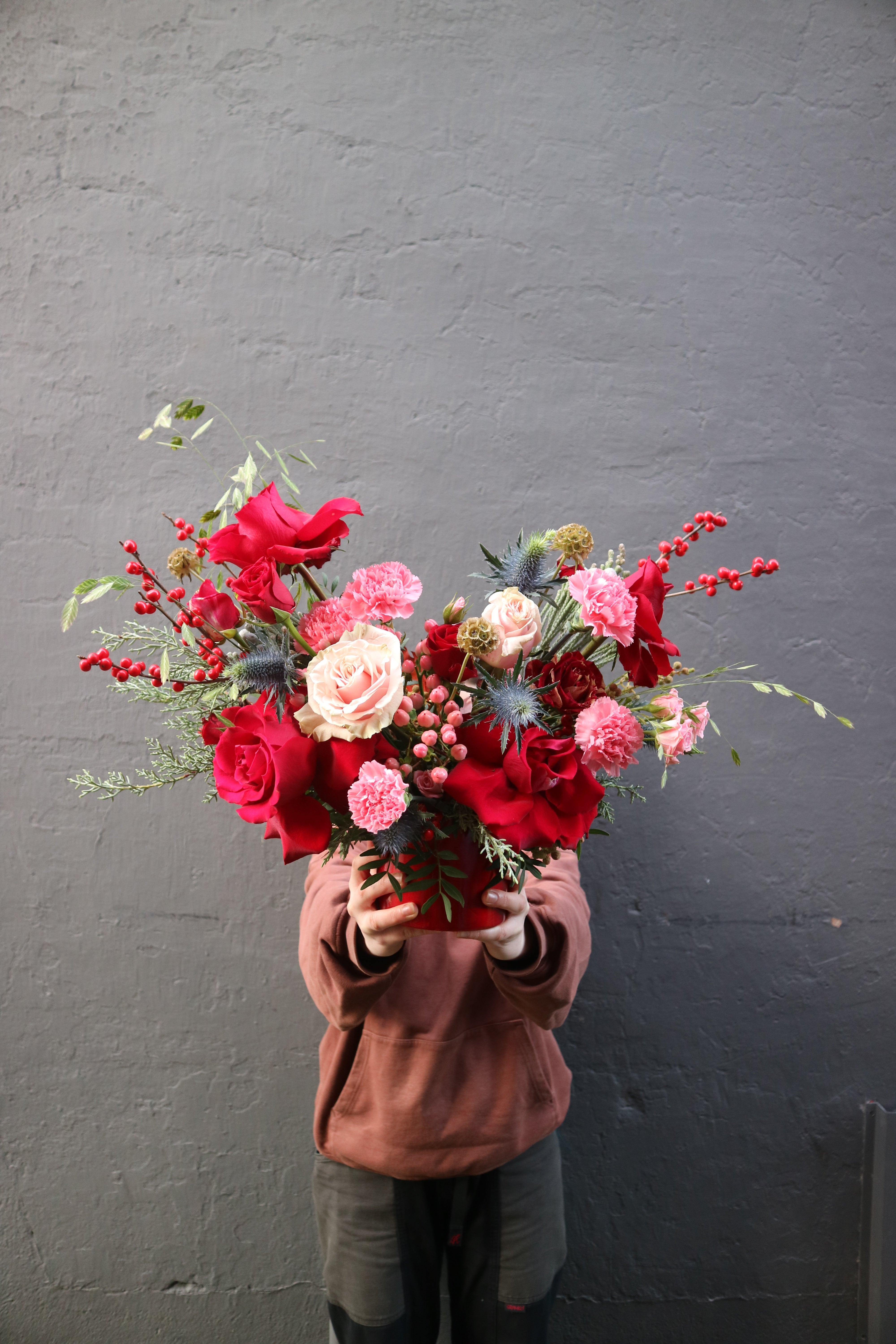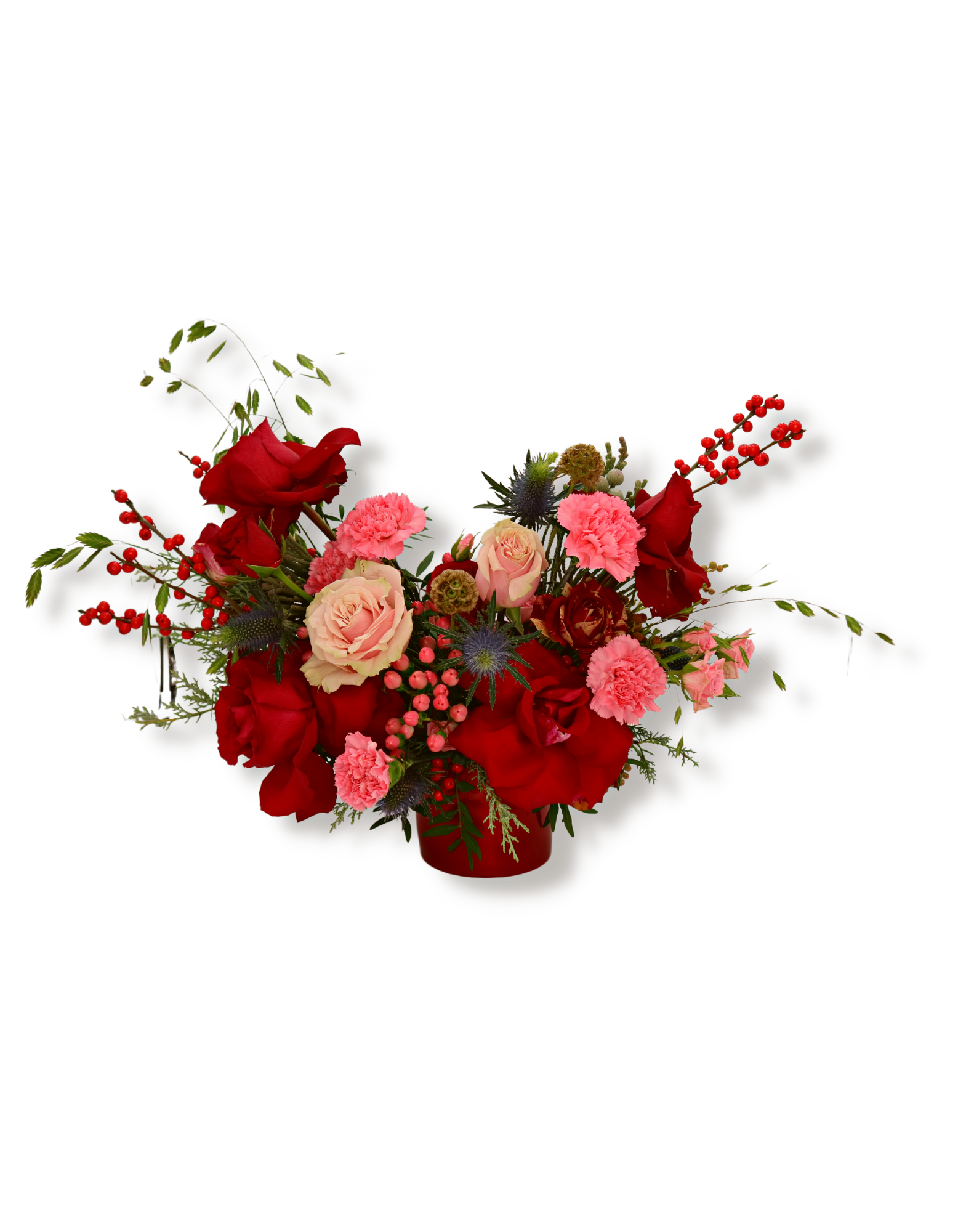 A knockout mix of pink and red blooms (think orchids, roses, ilex and all the seasonal beauts in between), artfully arranged in a ceramic pot.