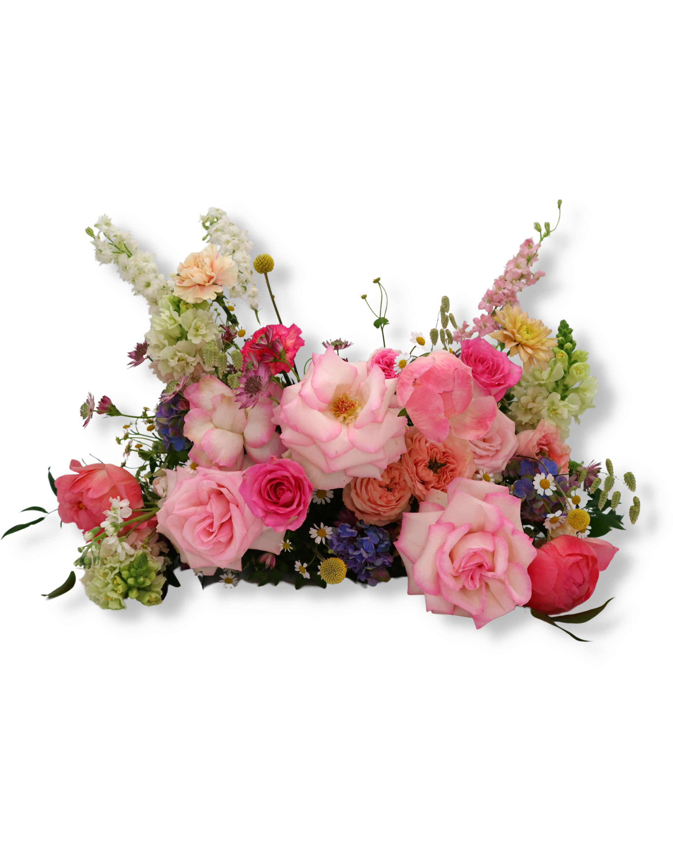 A long and low arrangement inspired by seasonal flowers from the garden, created in contrasting tones of pinks, purples, whites and a touch of orange/yellow made with seasonal flowers and foliages.