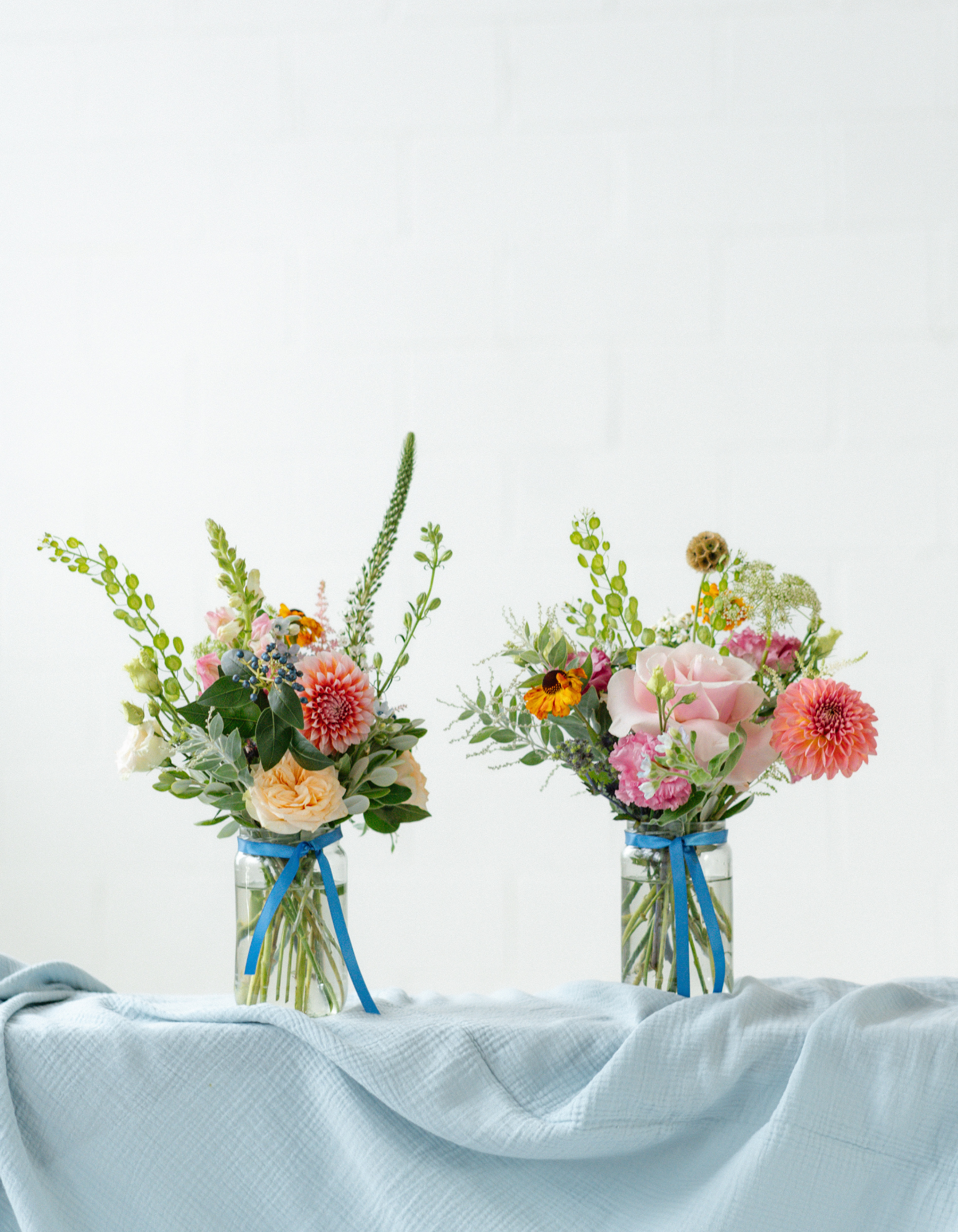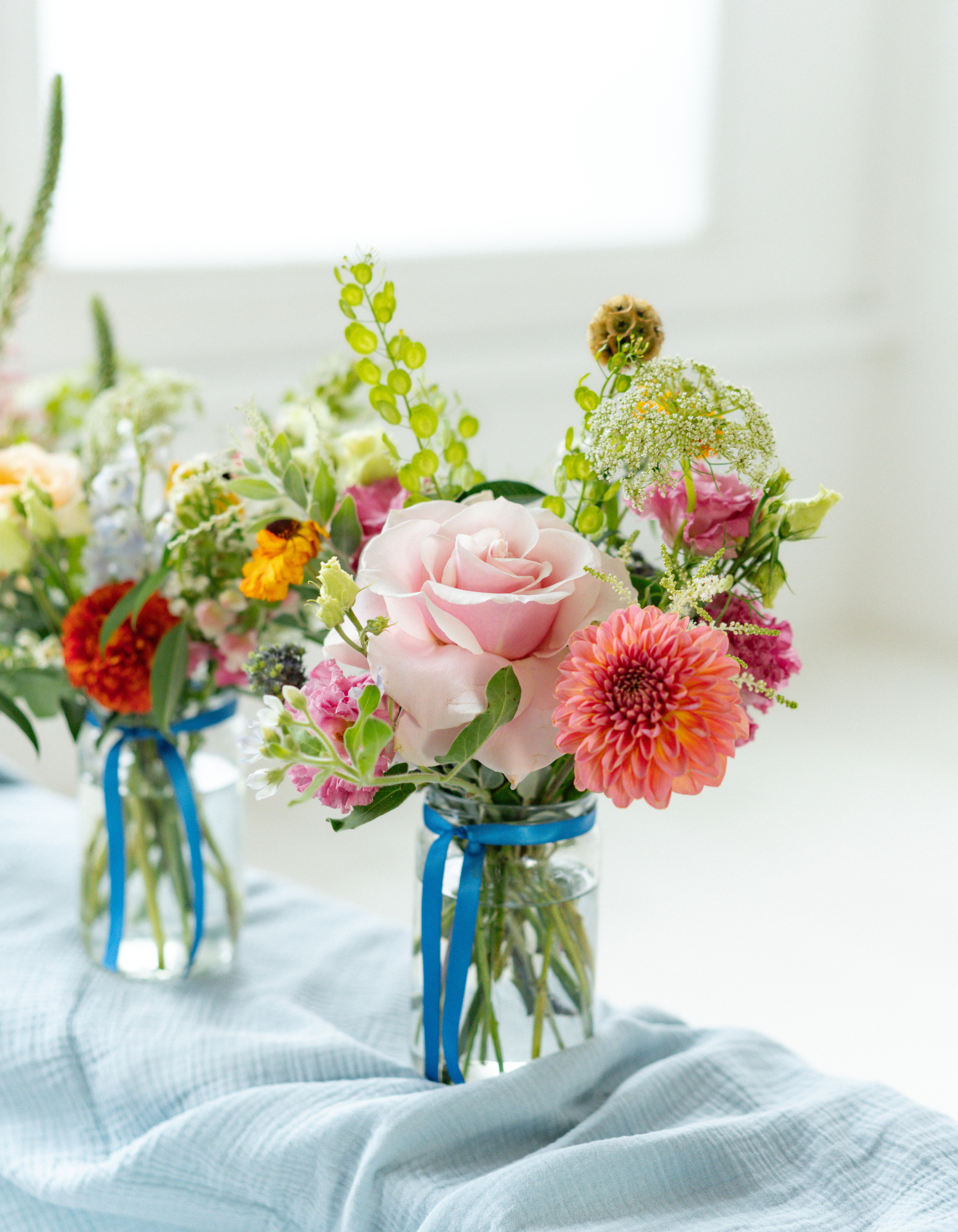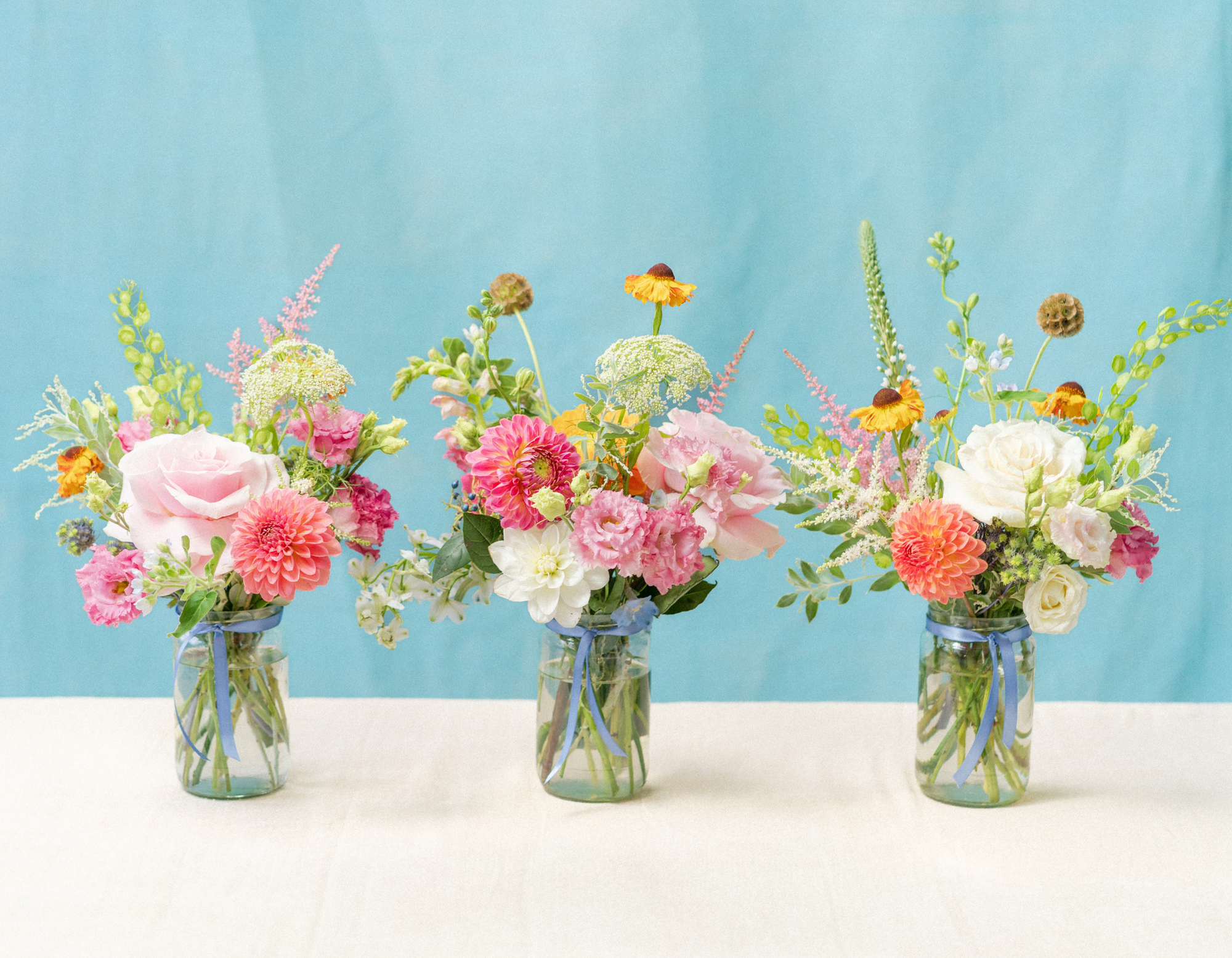 A set of 3 Jam or Mayo sized Jars, each filled with fresh seasonal flowers in your chosen colour palette. We vary the heights and textures for that effortless, natural look, never matchy-matchy, always beautifully balanced.