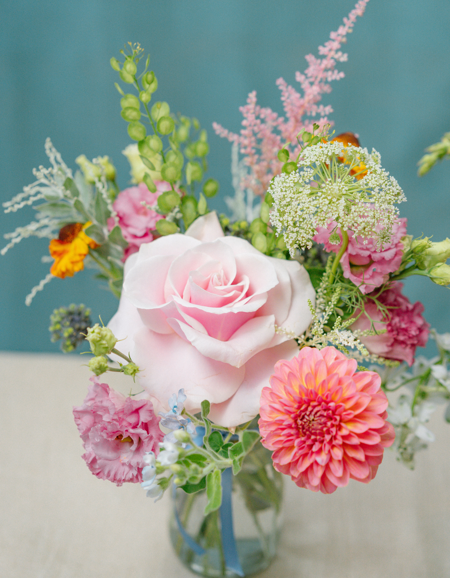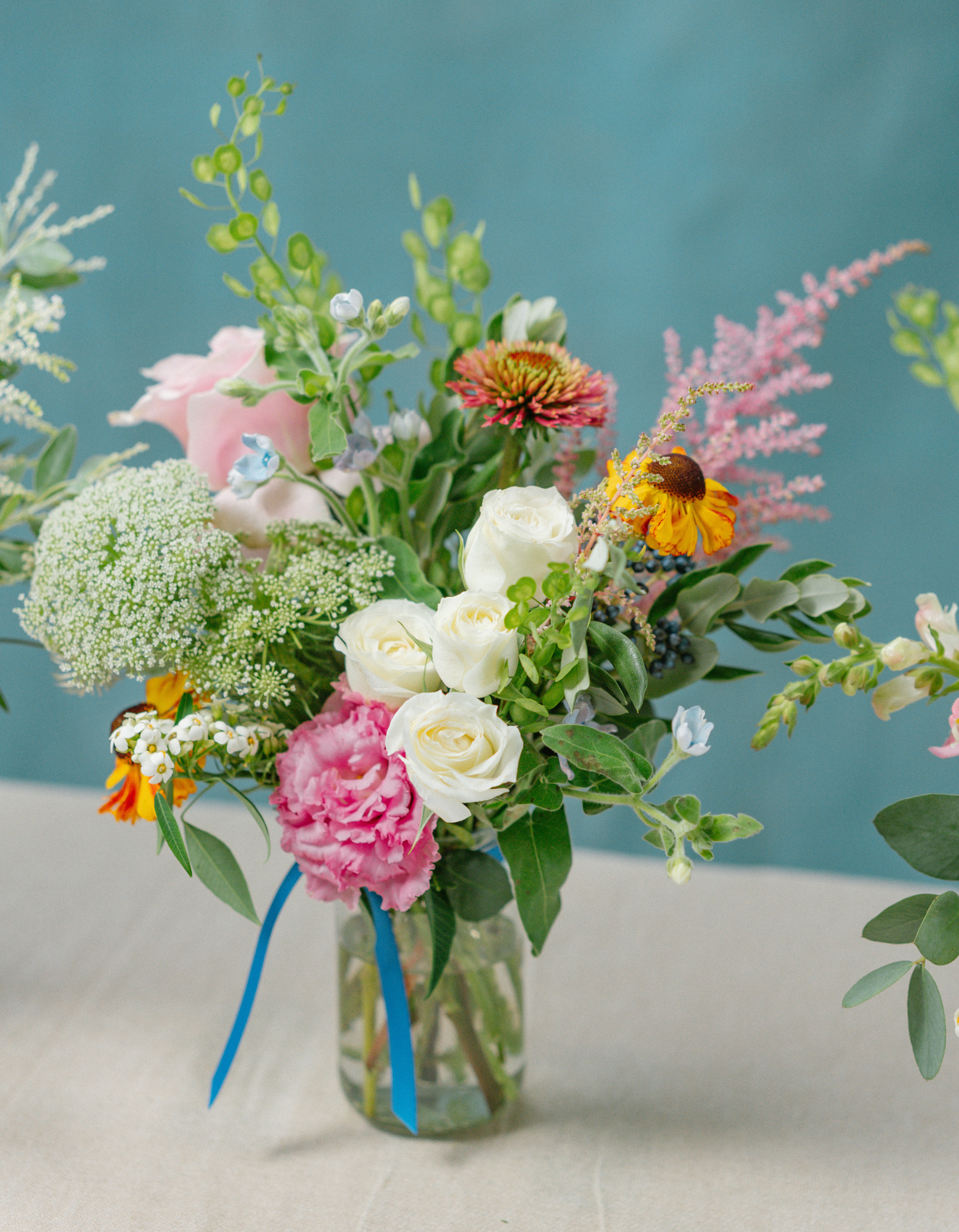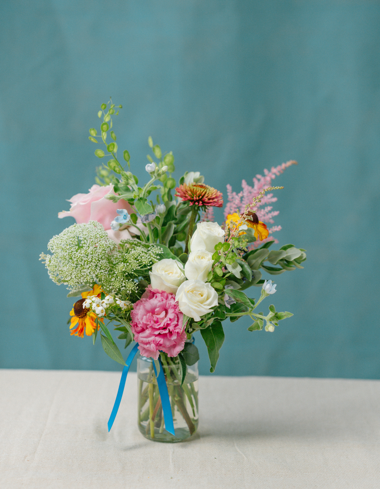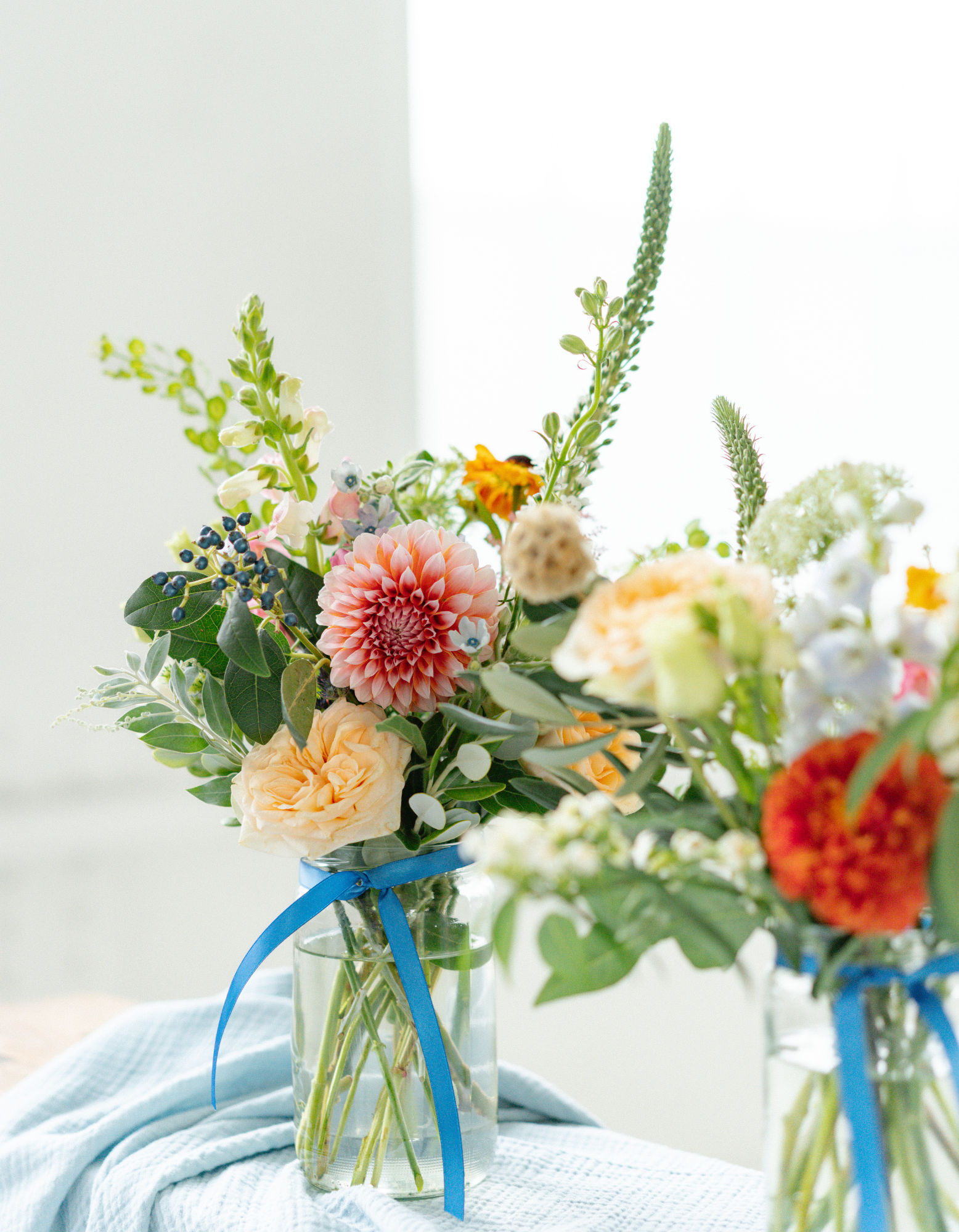 A set of 3 Jam or Mayo sized Jars, each filled with fresh seasonal flowers in your chosen colour palette. We vary the heights and textures for that effortless, natural look, never matchy-matchy, always beautifully balanced.