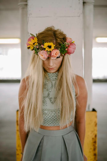 A romantic flower crown made with smaller blooms and seasonal greenery, wired together to create a natural floral circlet. Finished with soft ribbon ties so the fit can be adjusted to suit.