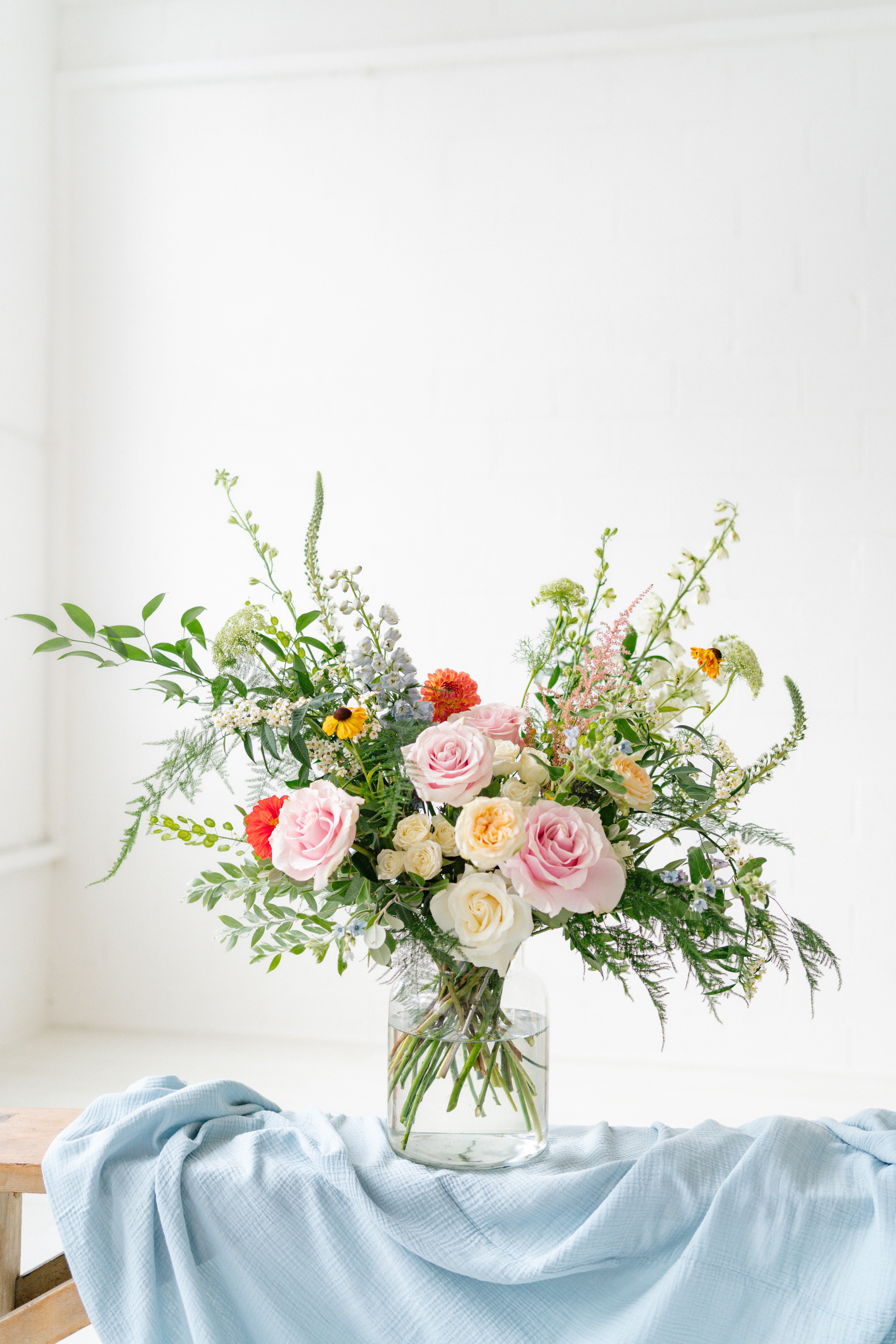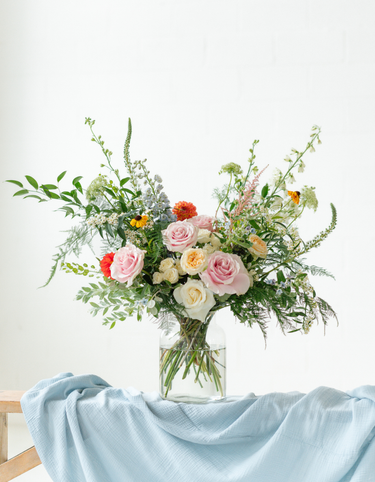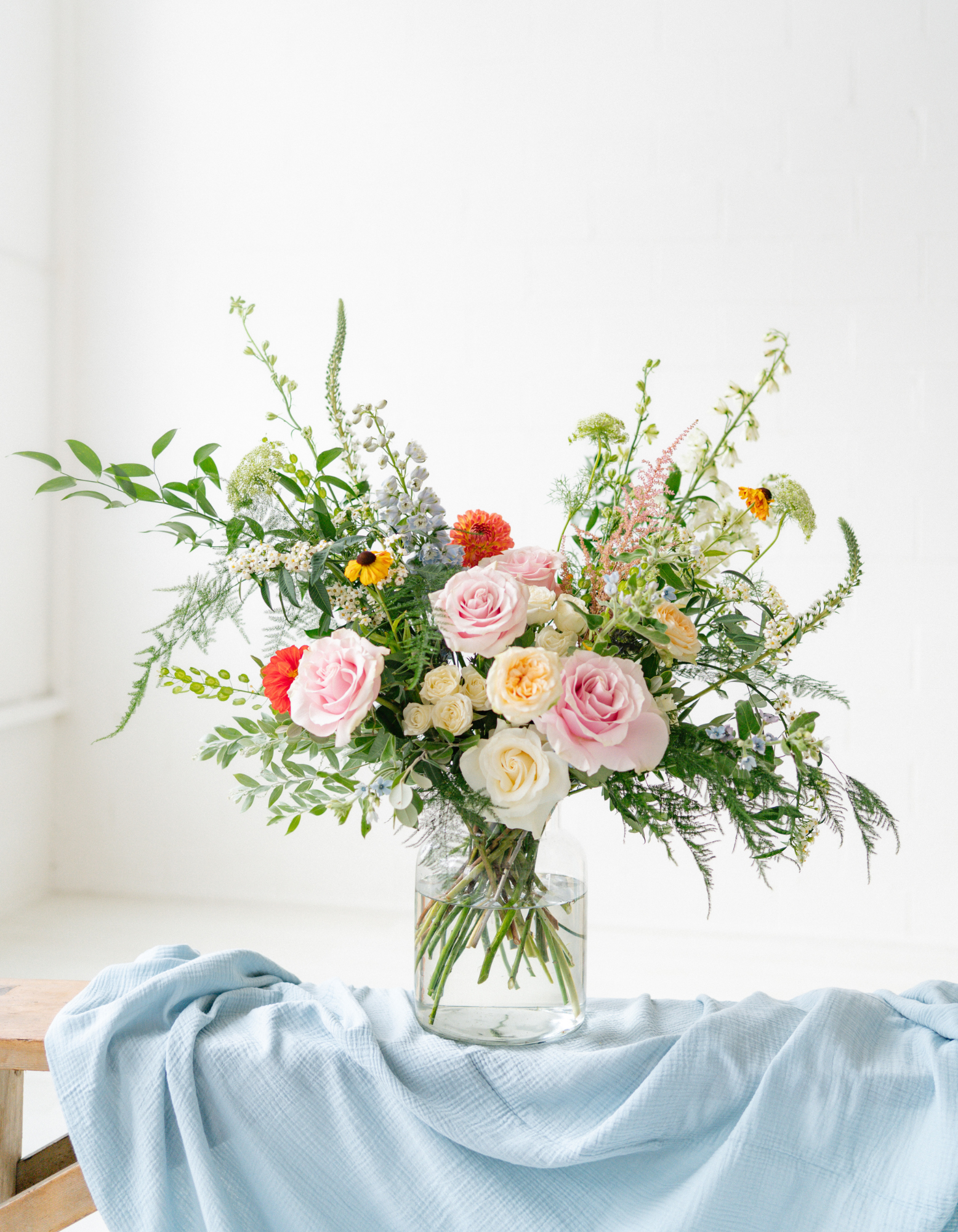 This gorgeous vase arrangement is a full on floral statement, designed with a mix of fresh seasonal blooms and lush foliage for maximum impact. Created as a front facing design, it lets the flowers take centre stage, natural, expressive, and unapologetically bold.
