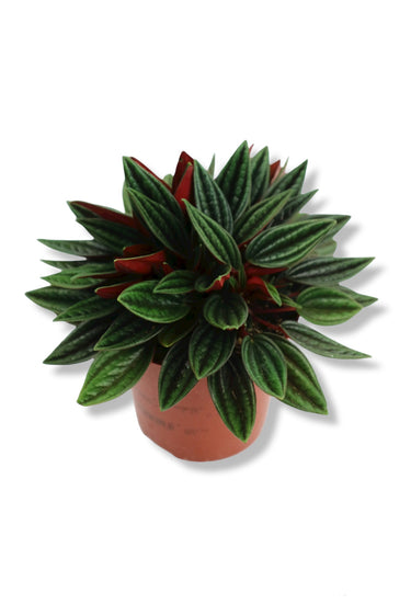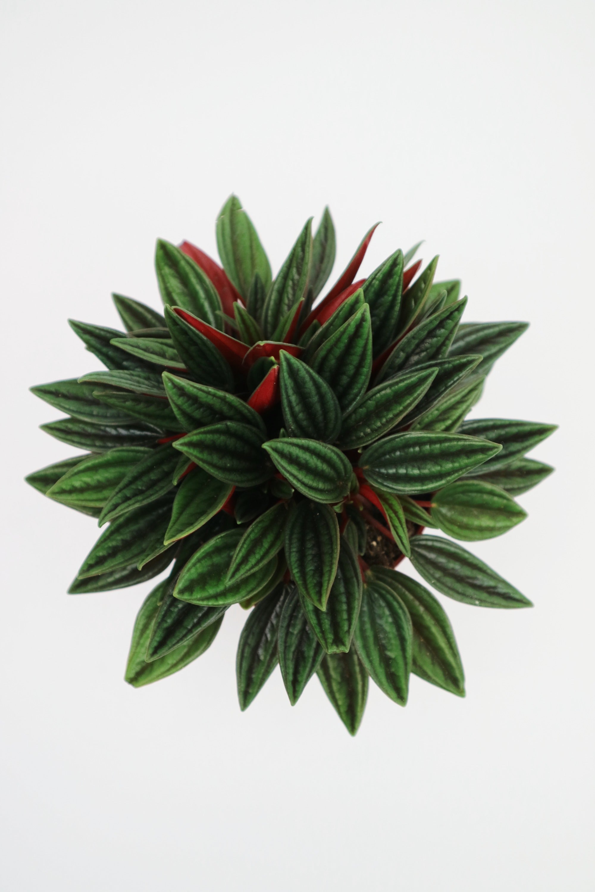 The Peperomia Rosso is a stunning variety of Peperomia, with its dark green, undulating leaves with a bright red underside. This plant is a shower and not a grower and will stay under a foot tall.