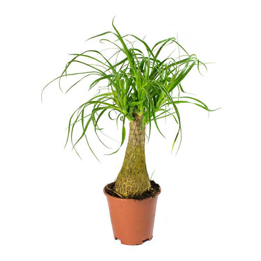 The Pony Tail Palm, also known as Beaucarnea Recurvata, or Nolina is a distinctive looking houseplant with a swollen thick brown stem at its base that stores water. The long narrow curly, dark green leaves flow up from this base much like a plume of water in a fountain.