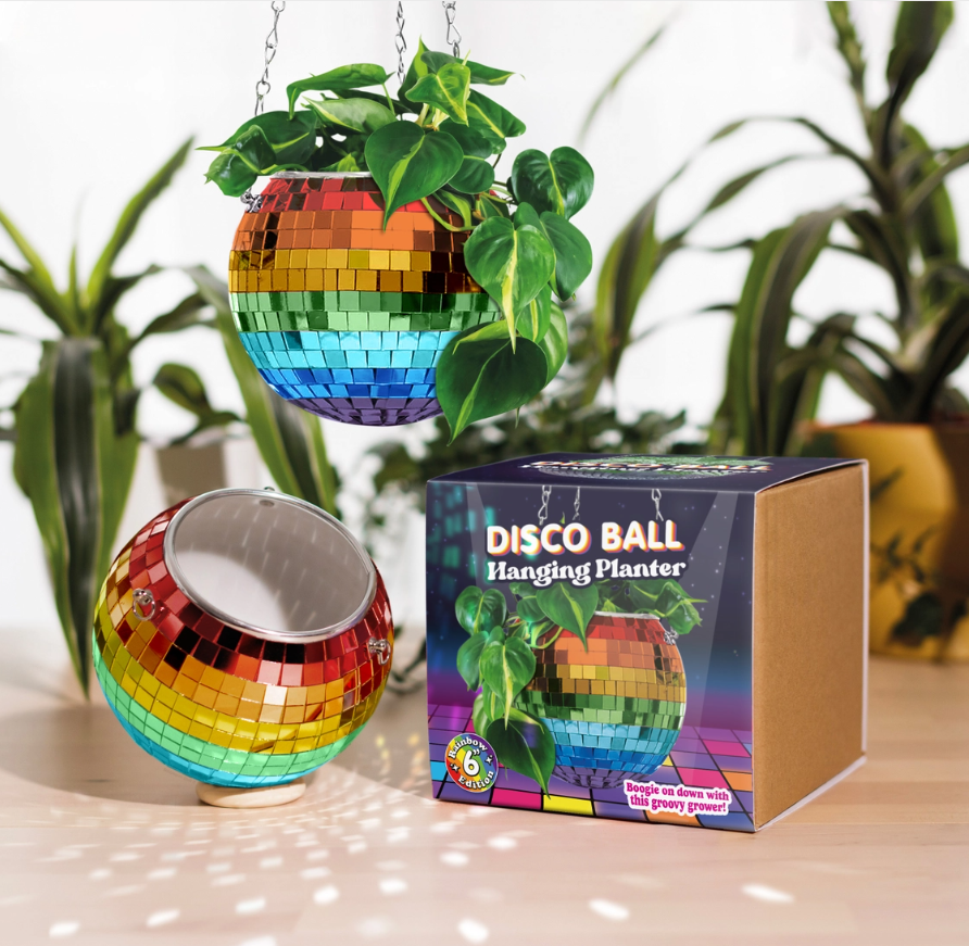 Disco Ball Hanging Planter: Rainbow Edition enables color-loving green- thumbed plant parents to turn their living room into a rainbow disco wonderland. The perfect hanging plant pot for a funky ficus or disco in-fern-o, this shimmering sphere brings the glamour of the dancefloor directly to any domestic space.