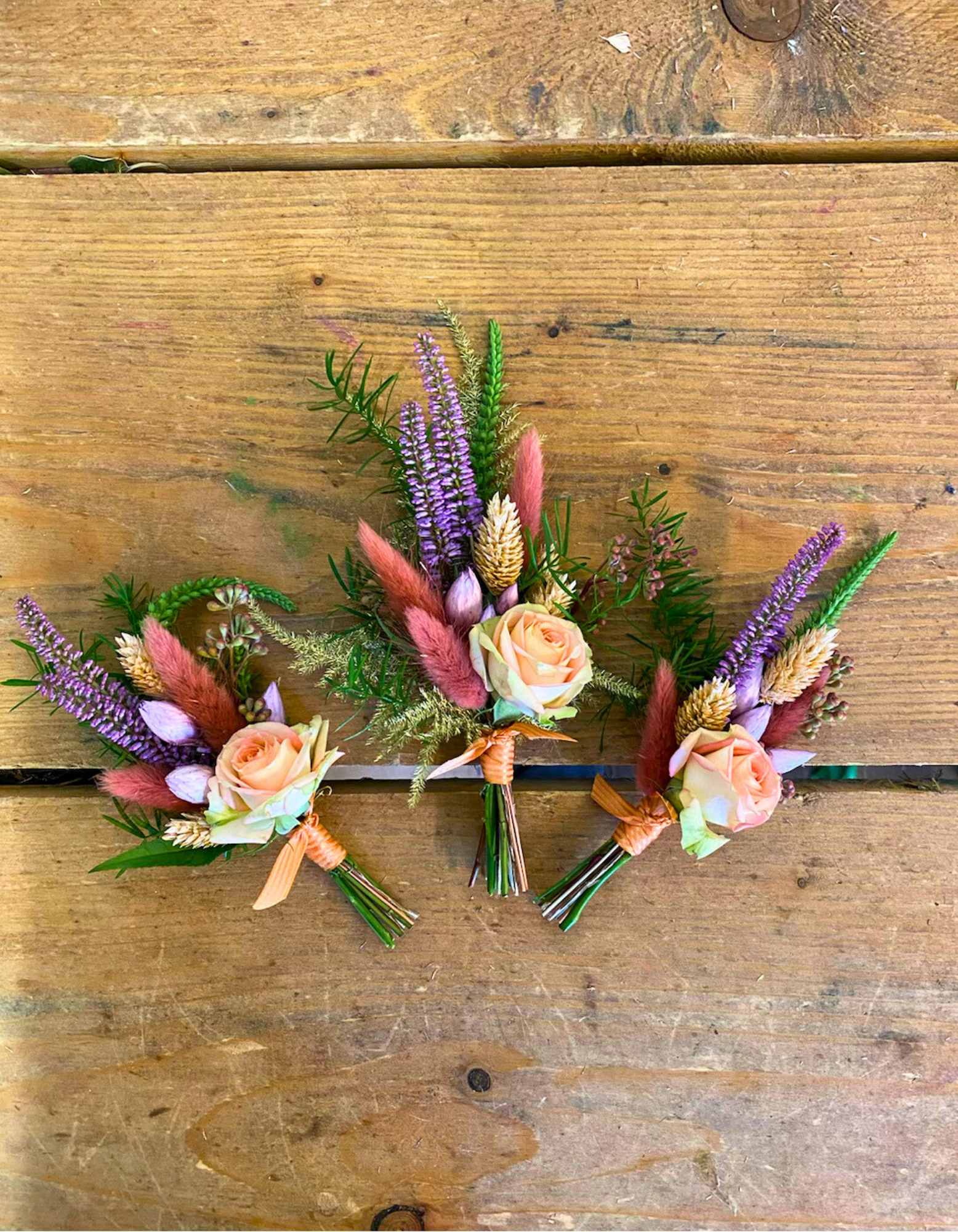 A pocket-sized pop of pastel. Each buttonhole is handcrafted with blooms from the Soft Serve palette, think blush tones, lilacs, soft yellows and creamy whites, tied off with a ribbon for a clean, modern finish.