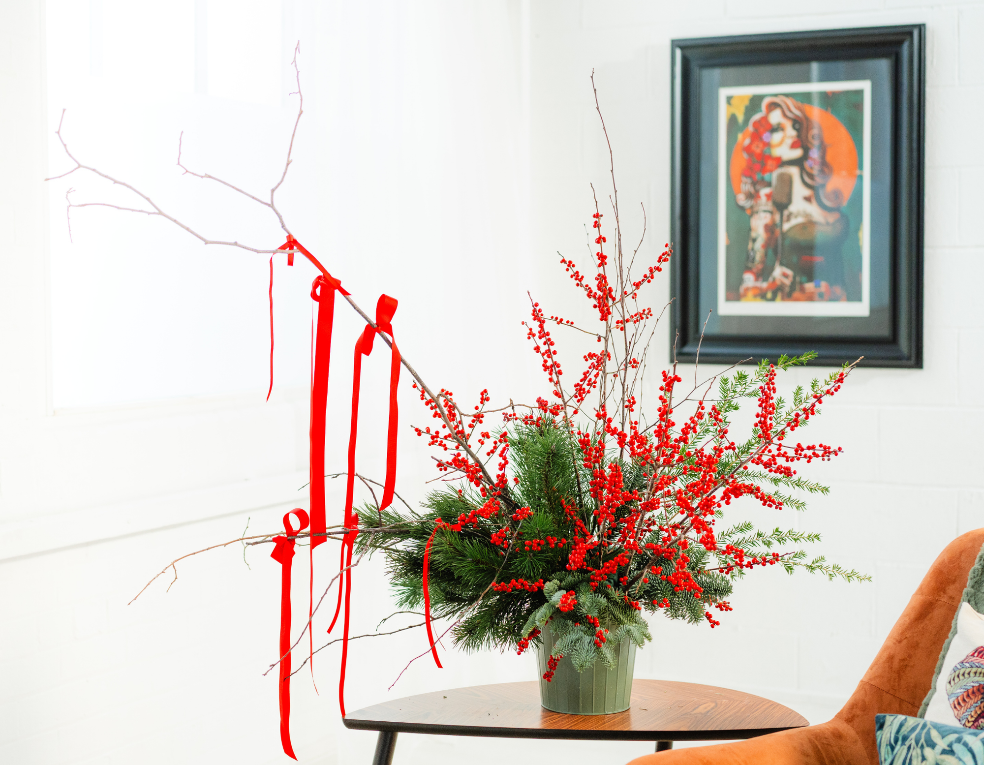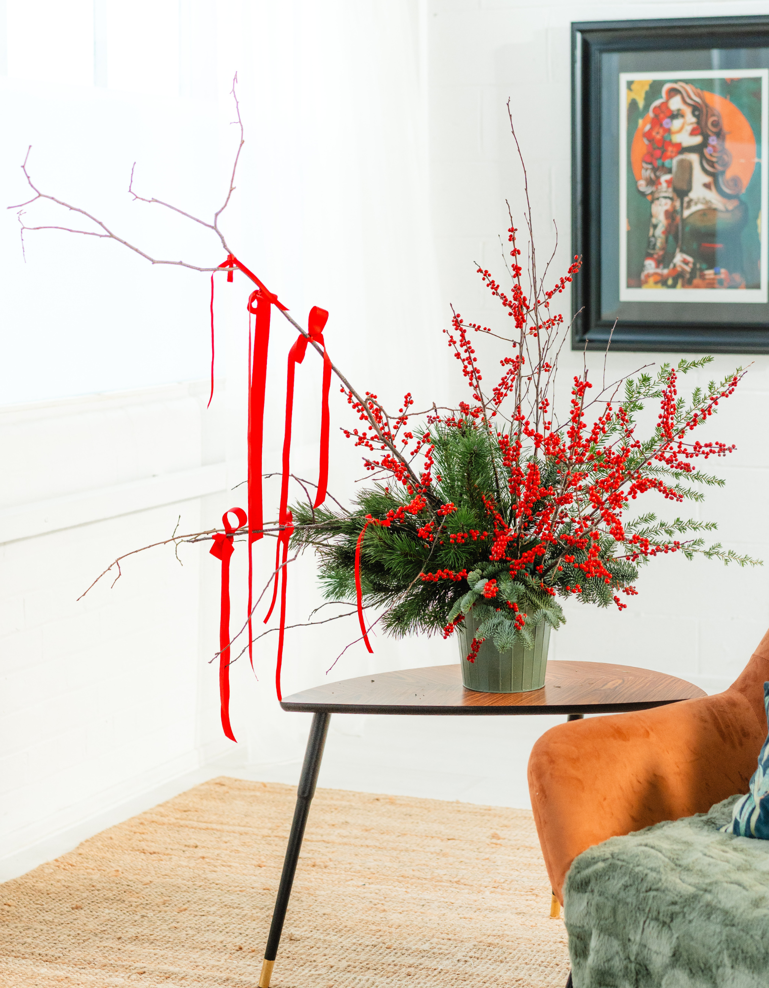 Big, bold, and full of festive attitude. Designed with dramatic winter branches, lush evergreens, and rich red berries, this statement piece is all about presence. Styled in a green pot and finished with flowing ribbons, it’s the showpiece your home didn’t know it needed.
