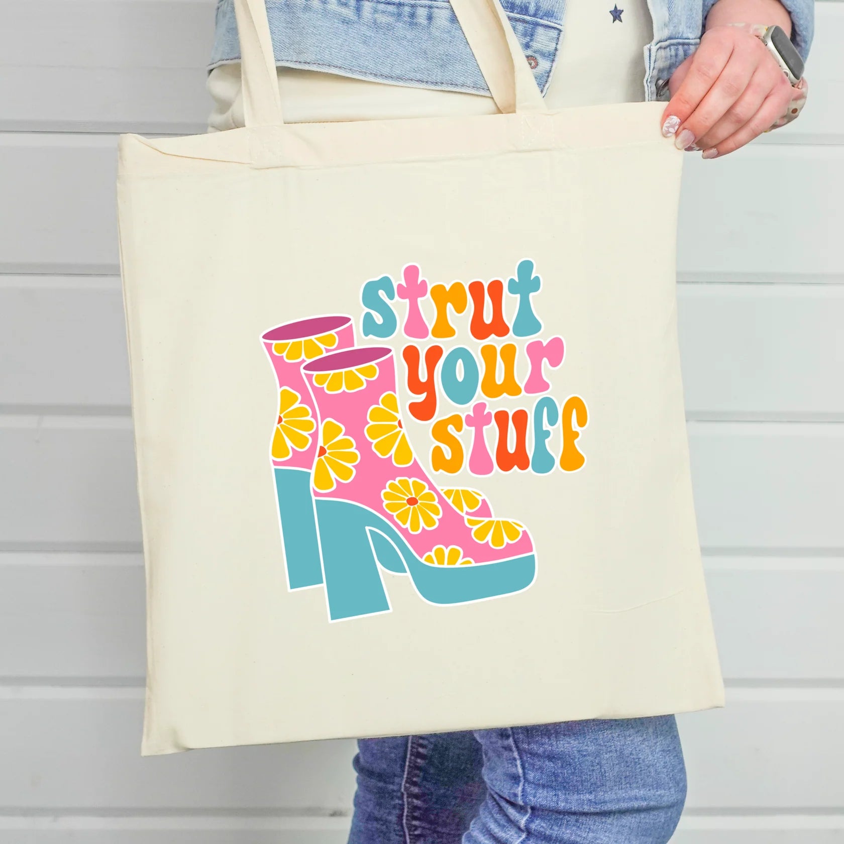 This tote bag features funky pink and blue boots with a yellow boho floral pattern. The quote "Strut Your Stuff" is a reminder to have fun, express yourself freely, and dance like nobody's watching.