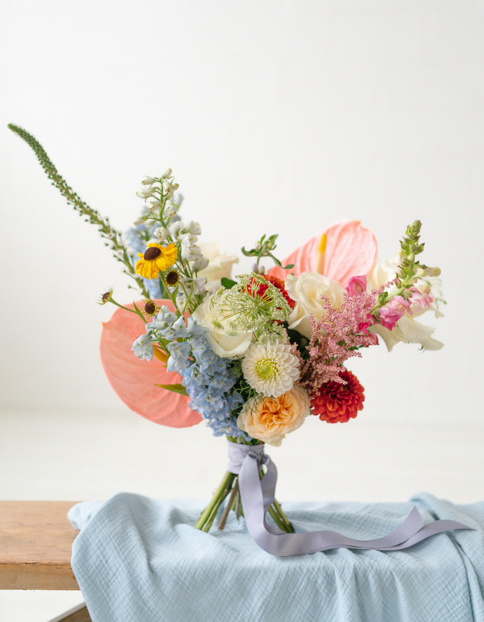 Designed as a one off bouquet bursting with beautiful seasonal blooms, finished with a classic satin ribbon handle in a coordinating shade.