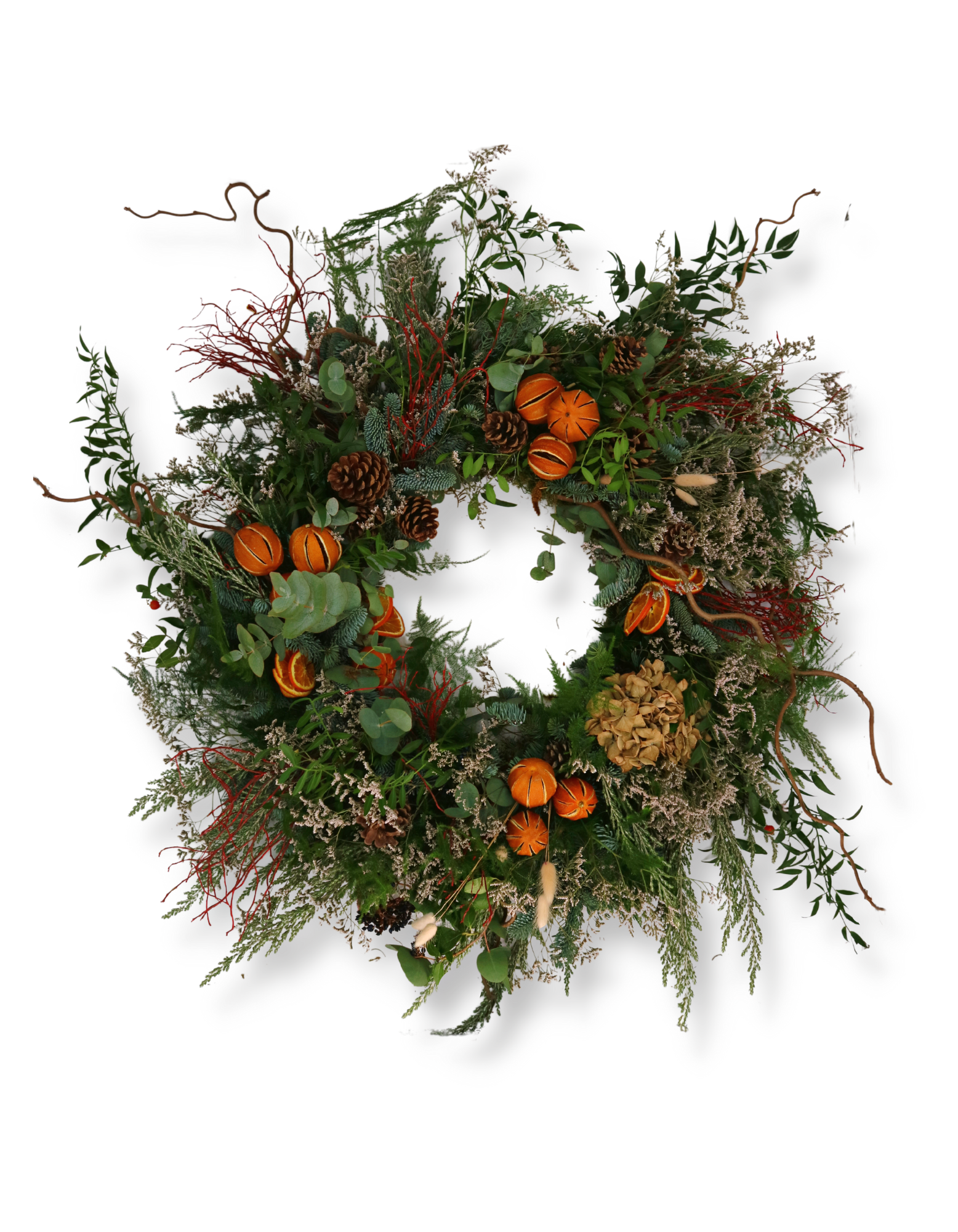 Each wreath is one-of-a-kind, dressed with a seasonal mix of foliage, dried fruits, and festive flowers for that wild, natural look that still feels refined.